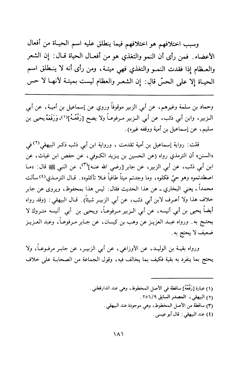 قلت: رواية إسماعيل بن أمية تقدمت، ورواية ابن أبي ذئب ذكر البيهقي في "السنن" أن الترمذي رواه (عن الحسين بن يزيد الكوفي، عن حفص ابن غياث، عن ابن أبي ذئب، عن أبي الزبير، عن جابر - رضي الله عنه -، عن النبي - صلى الله عليه وسلم - قال: "ما اصطدتموه وهو حىّ فكلوه، وما وجدتم ميتًا طافيًا فلا تأكلوه". قال الترمذي سألت محمدًا -يعني البخاري- عن هذا الحديث فقال: ليس هذا بمحفوظ، ويروى عن جابر خلاف هذا ولا أعرف لابن أبي ذئب، عن أبي الزبير شيئًا). قال البيهقي: (وقد رواه أيضًا يحيى بن أبي أنيسه، عن أبي الزبير مرفوعًا، ويحيى بن أبي أنيسه متروك لا يحتج به. ورواه عبد العزيز عن وهب بن كيسان، عن جابر مرفوعًا، وعبد العزيز ضعيف لا يحتج به.