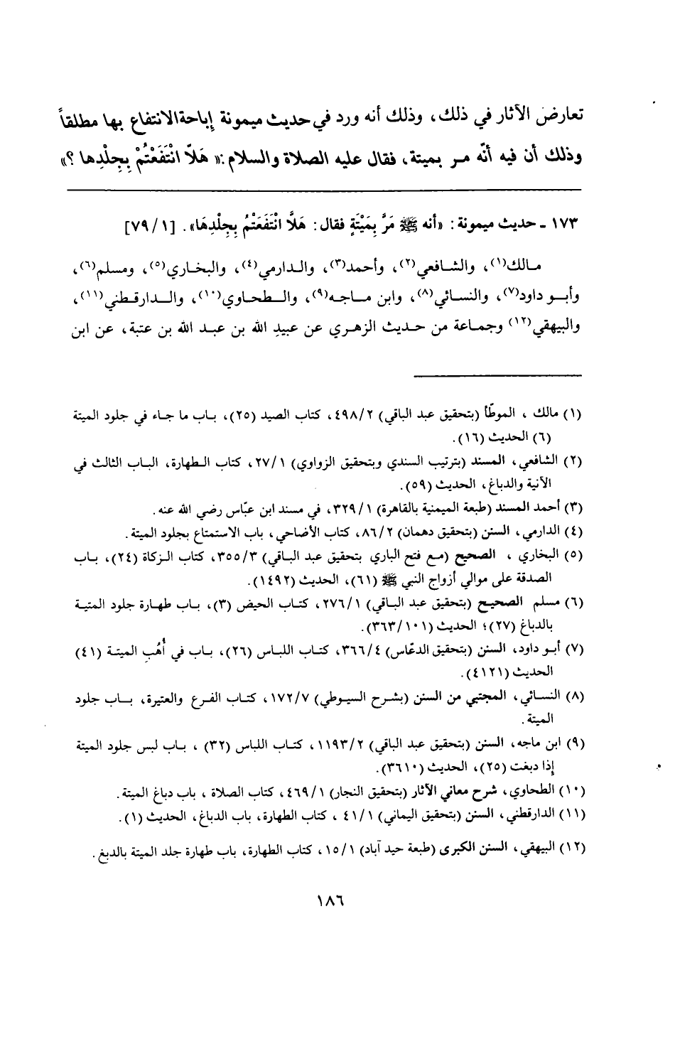 173 - حديث ميمونة: "أنه - صلى الله عليه وسلم - مَرَّ بِمَيْتَةٍ فقال: هَلا انْتَفَعَتْمُ بِجِلْدهَا".