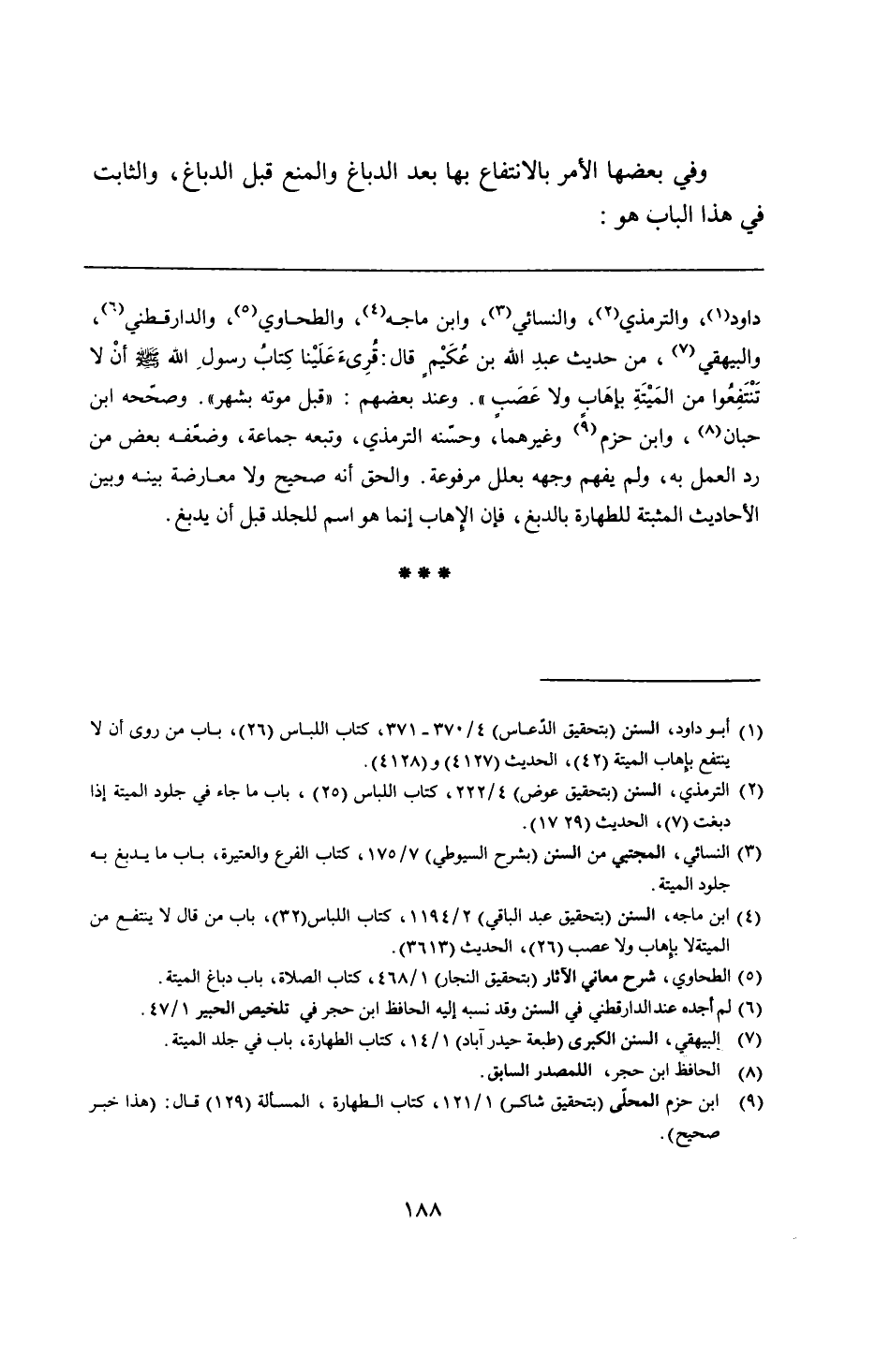 داود، والترمذي، والنسائي، وابن ماجه، والطحاوي، والدارقطني، والبيهقي، من حديث عبدِ الله بن عُكَيْمٍ قال: قُرِئَ عَلَيْنا كِتابُ رسولِ الله - صلى الله عليه وسلم - أنْ لا تَنْتَفِعُوا من المَيْتَةِ بإهَاب ولا عَصَبٍ". وعند بعضهم: "قبل موته بشهر". وصحّحه ابن حبان، وابن حزم وغيرهما، وحسّنه الترمذي، وتبعه جماعة، وضعّفه بعض من رد العمل به، ولم يفهم وجهه بعلل مرفوعة. والحق أنه صحيح ولا معارضة بينه وبين الأحاديث المثبتة للطهارة بالدبغ، فإن الإهاب إنما هو اسم للجلد قبل أن يدبغ.