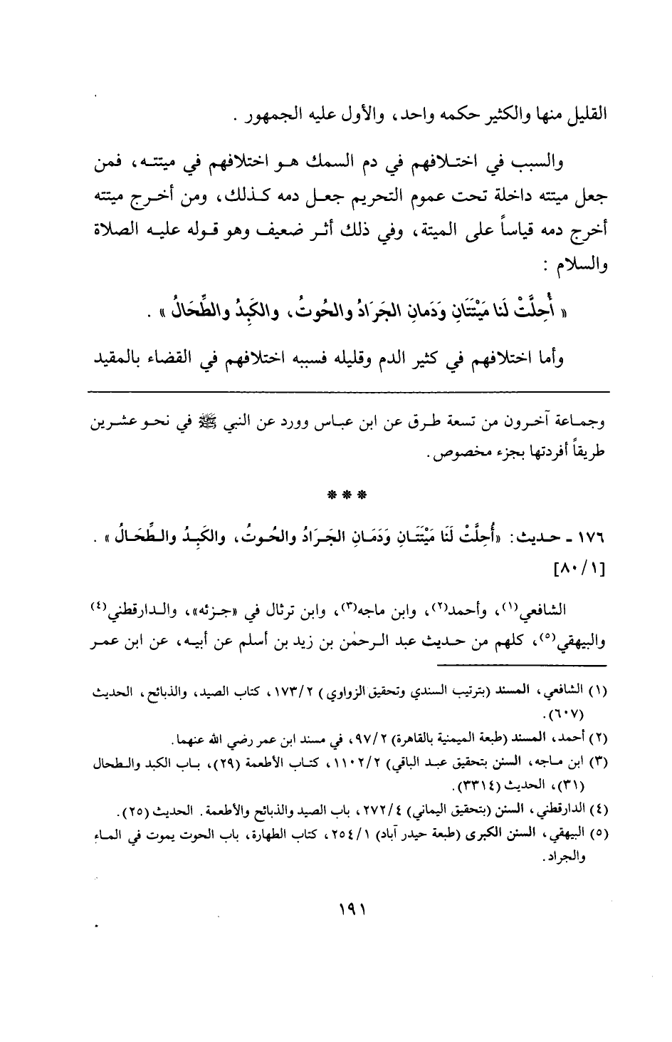 176 - حديث: "أُحِلَّتْ لَنَا مَيْتَتَانِ وَدَمَانِ الجَرَادُ والحُوتُ، والكَبِدُ والطِّحَالُ".