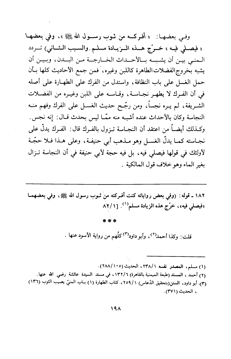 182 - قوله: (وفي بعض رواياته كنت أفركته من ثوب رسول الله - صلى الله عليه وسلم -، وفي بعضهما "فيصلي فيه"، خرّج هذه الزيادة مسلم.