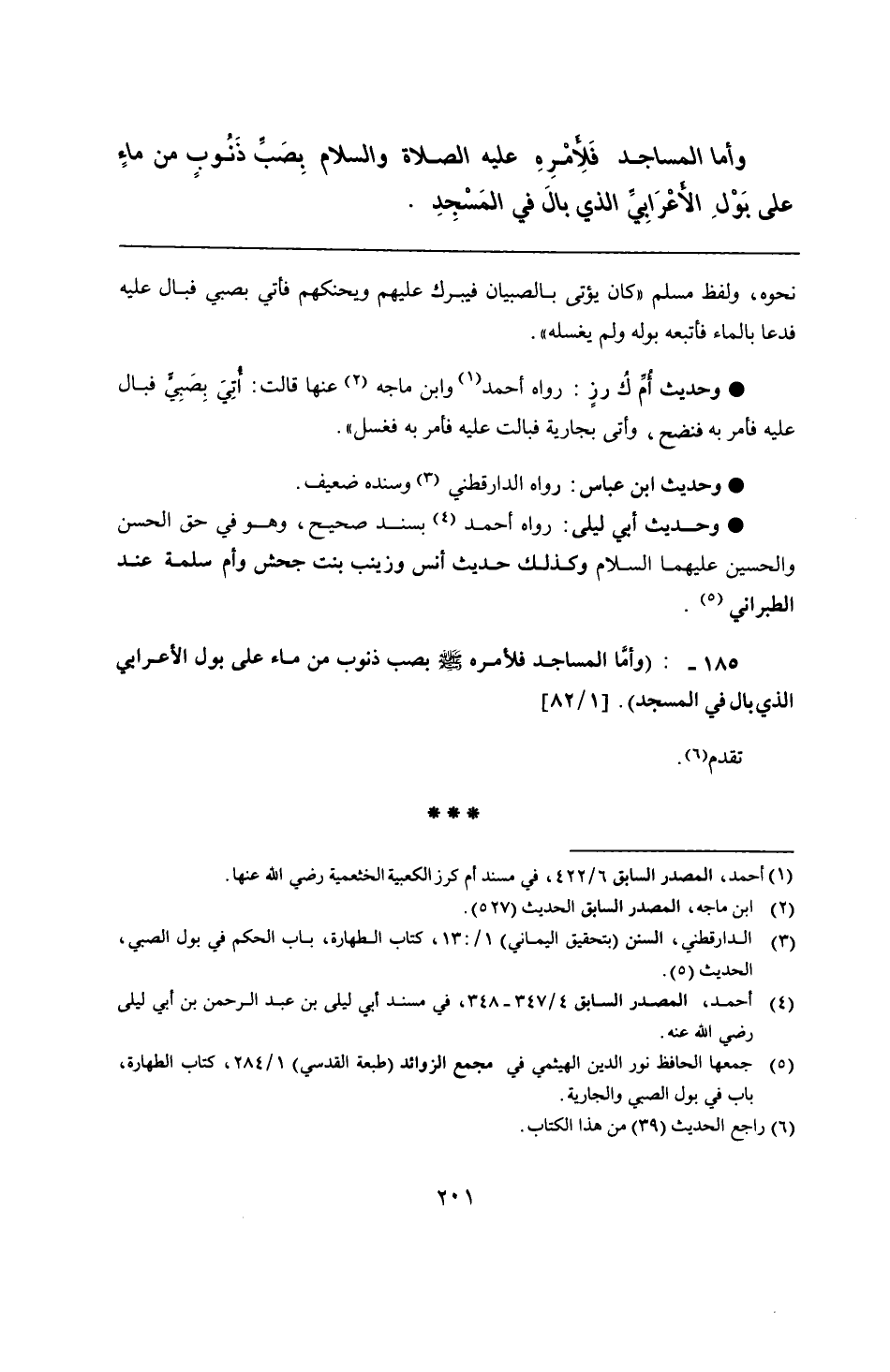 185 - : (وأمّا المساجد فلأمره - صلى الله عليه وسلم - بصب ذنوب من ماء على بول الأعرابي الذي بال في المسجد).