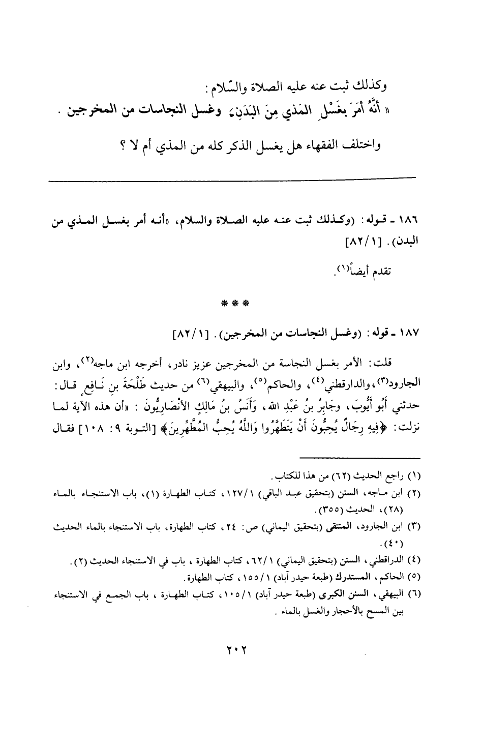 قلت: الأمر بغسل النجاسة من المخرجين عزيز نادر، أخرجه ابن ماجه، وابن الجارود، والدارقطني، والحاكم، والبيهقي من حديث طَلْحَةَ بنِ نَافِعٍ قال: حدثني أَبُو أَيُّوبَ، وجَابِرُ بن عَبْدِ الله، وَأَنَسُ بنُ مَالِكٍ الأنْصَارِيُّونَ: "أن هذه الآية لما نزلت: {فِيهِ رِجَالٌ يُحِبُّونَ أَنْ يَتَطَهَّرُوا وَاللَّهُ يُحِبُّ الْمُطَّهِّرِينَ} [التوبة 9: 108] فقال