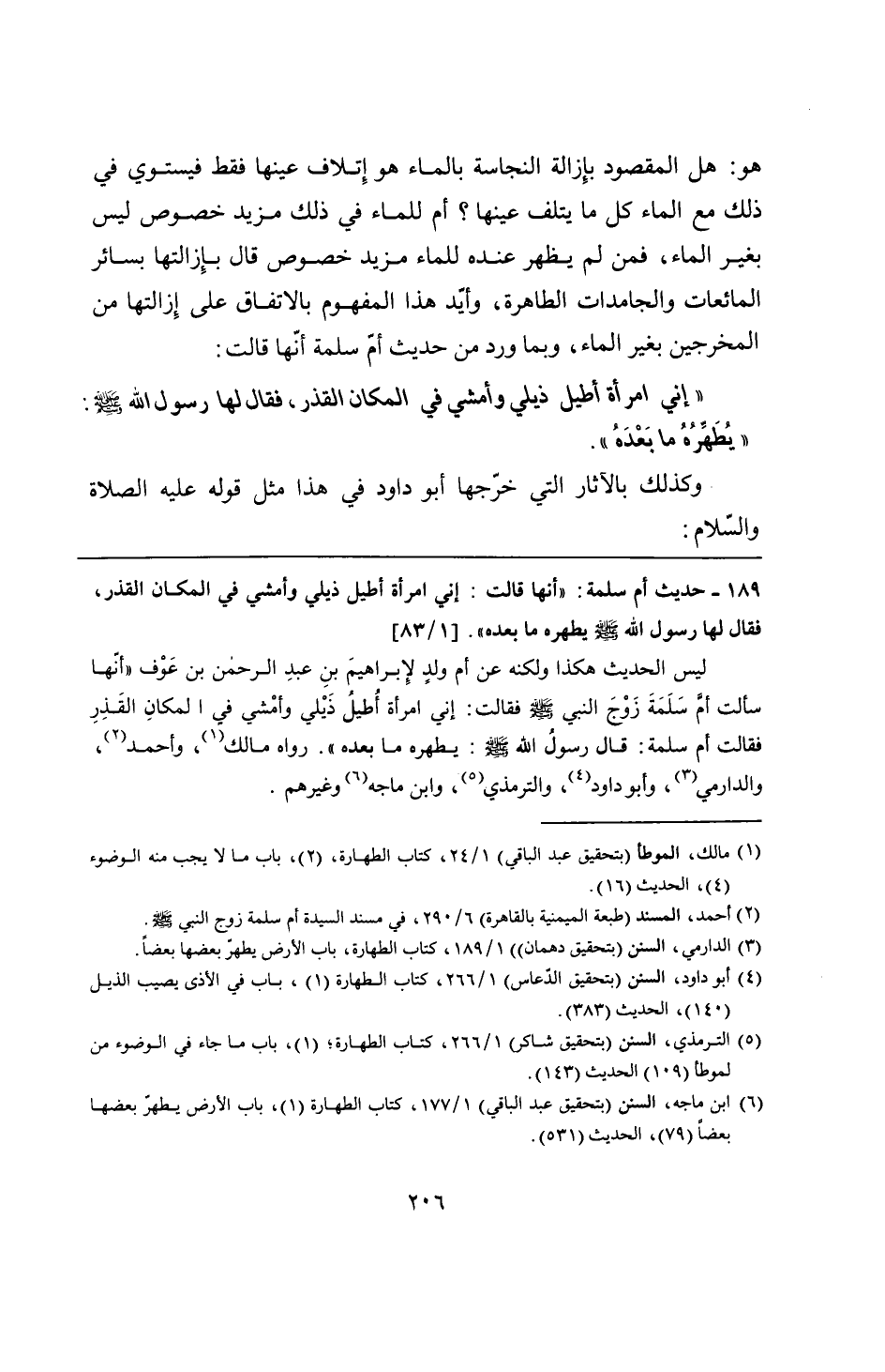 189 - حديث أم سلمة: "أنها قالت: إني امرأة أطيل ذيلي وأمشي في المكان القذر، فقال لها رسول الله - صلى الله عليه وسلم - يطهره ما بعده".