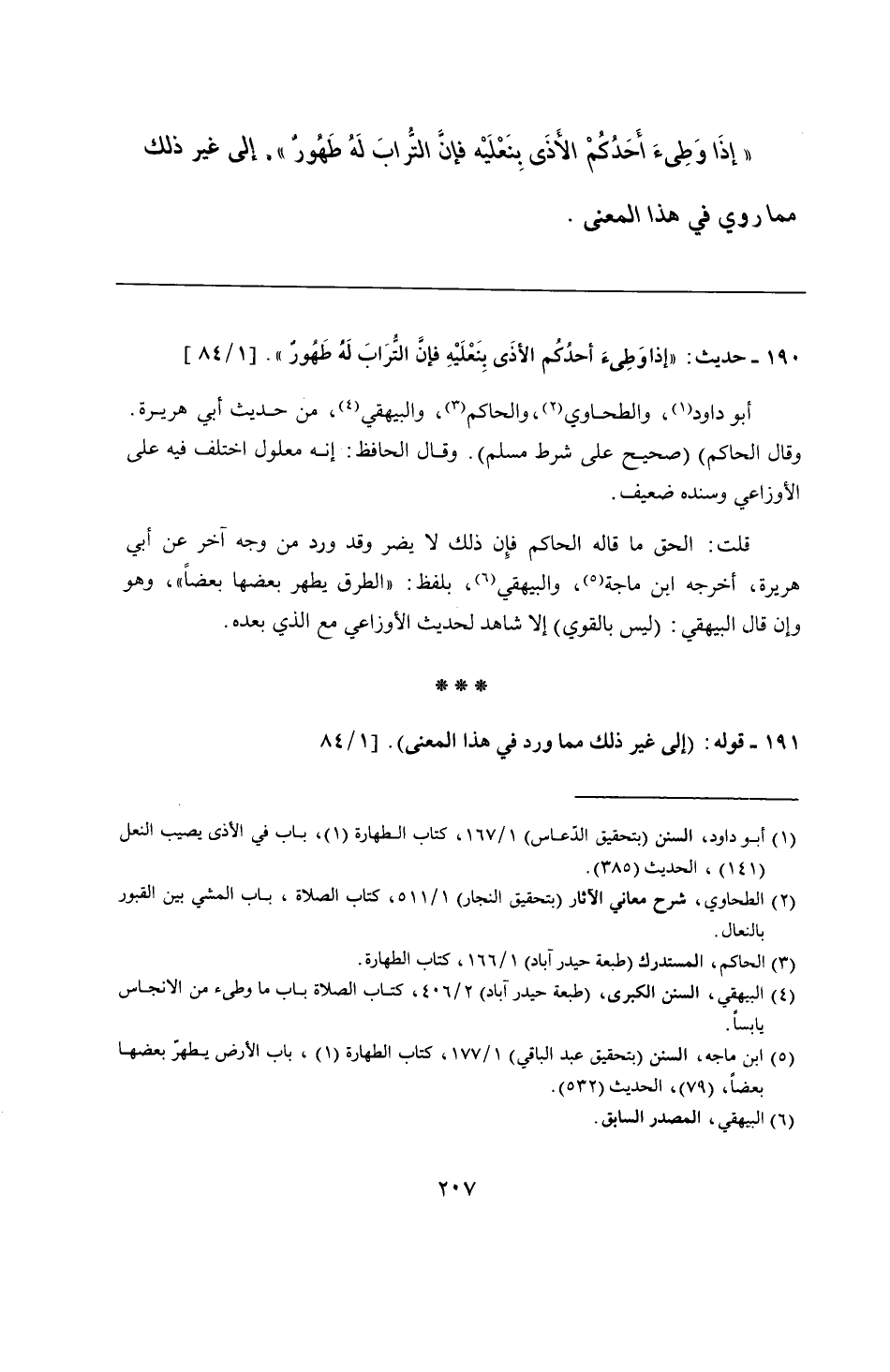 190 - حديث: "إذا وَطِئَ أحدُكُم الأذَى بِنَعْلَيْهِ فإنَّ التُرَابَ لَهُ طَهُورٌ".