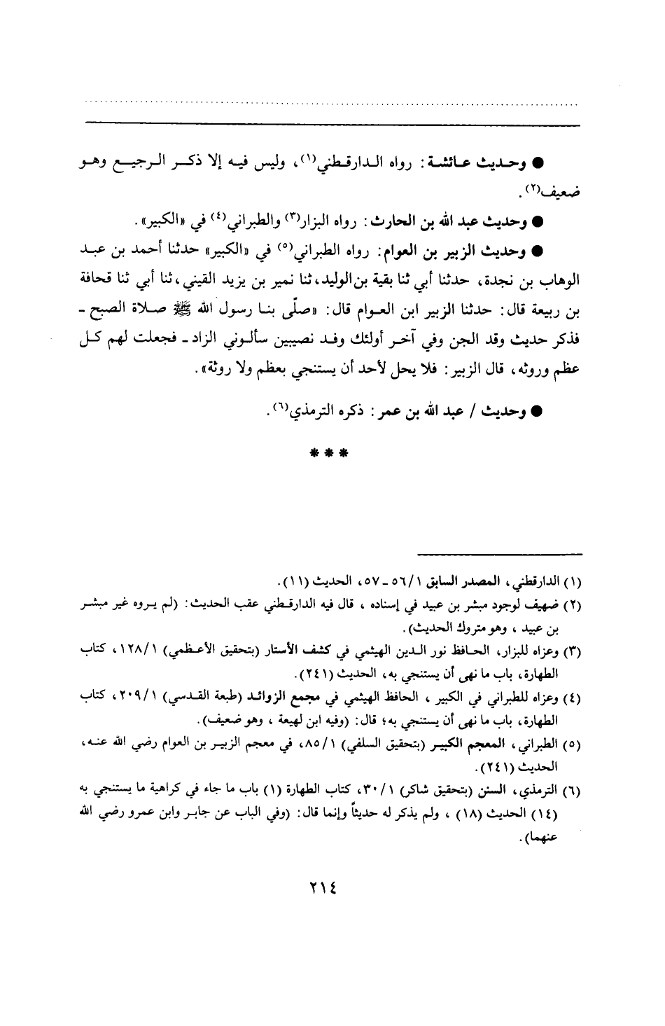 • وحديث الزبير بن العوام: رواه الطبراني في "الكبير" حدثنا أحمد بن عبد الوهاب بن نجدة، حدثنا أبي ثنا بقية بن الوليد، ثنا نمير بن يزيد القيني، ثنا أبي ثنا قحافة بن ربيعة قال: حدثنا الزبير ابن العوام قال: "صلّى بنا رسول الله - صلى الله عليه وسلم - صلاة الصبح -فذكر حديث وقد الجن وفي آخر أولئك وفد نصيبين سألوني الزاد- فجعلت لهم كل عظم وروثه، قال الزبير: فلا يحل لأحد أن يستنجي بعظم ولا روثة".