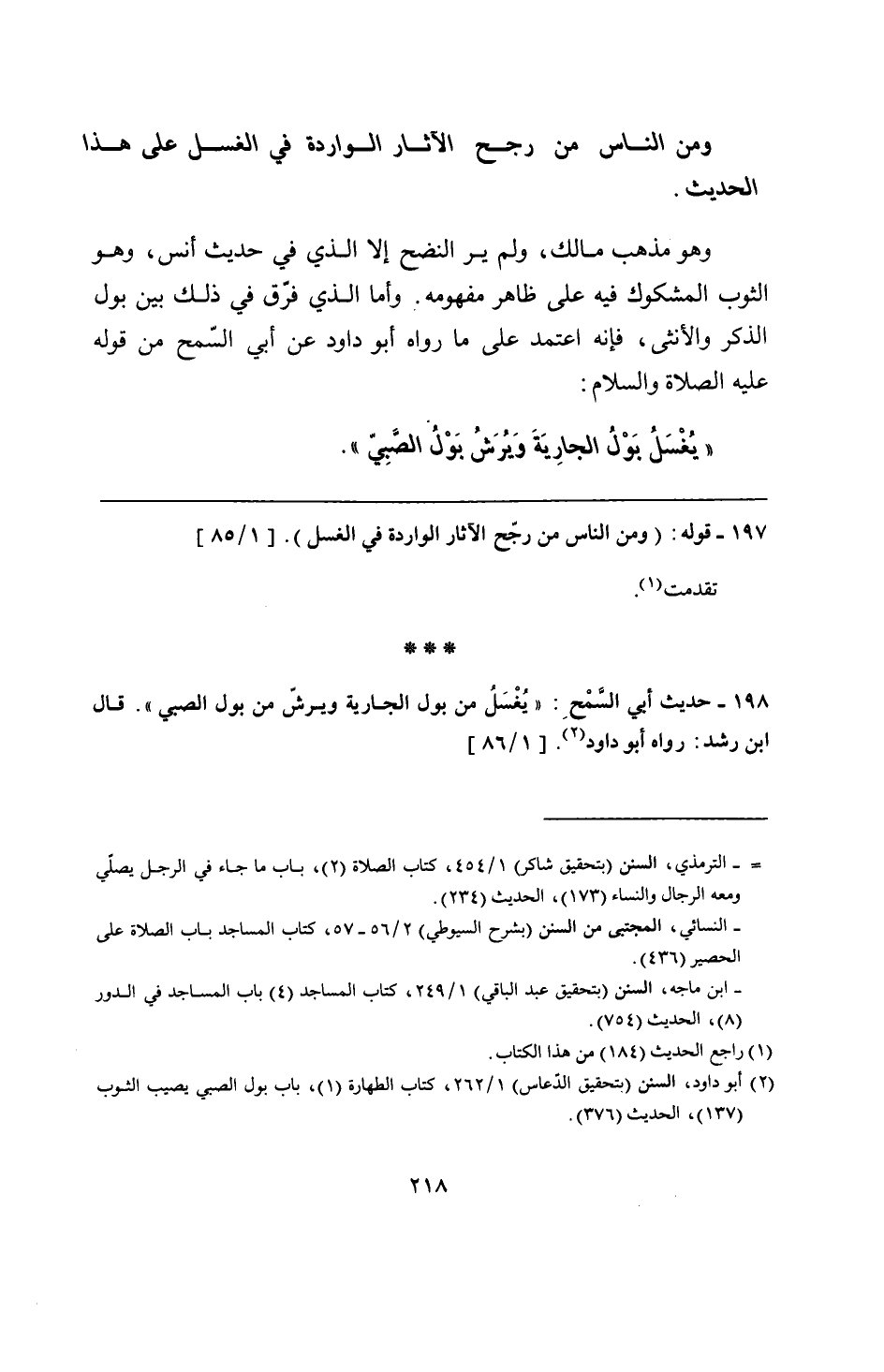 198 - حديث أبي السَّمْحِ: "يُغْسَلُ من بول الجارية ويرشّ من بول الصبي". قال ابن رشد: رواه أبو داود.