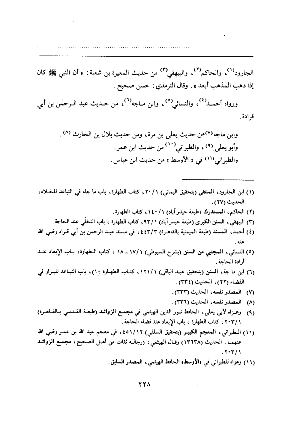 الجارود، والحاكم، والبيهقي من حديث المغيرة بن شعبة: "أن النبي - صلى الله عليه وسلم - كان إذا ذهب المذهب أبعد". وقال الترمذي: حسن صحيح.