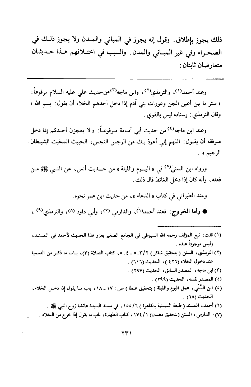 ورواه ابن السني في "اليوم والليلة" من حديث أنس، عن النبي - صلى الله عليه وسلم - من فعله، وأنه كان إذا دخل الغائط قال ذلك.