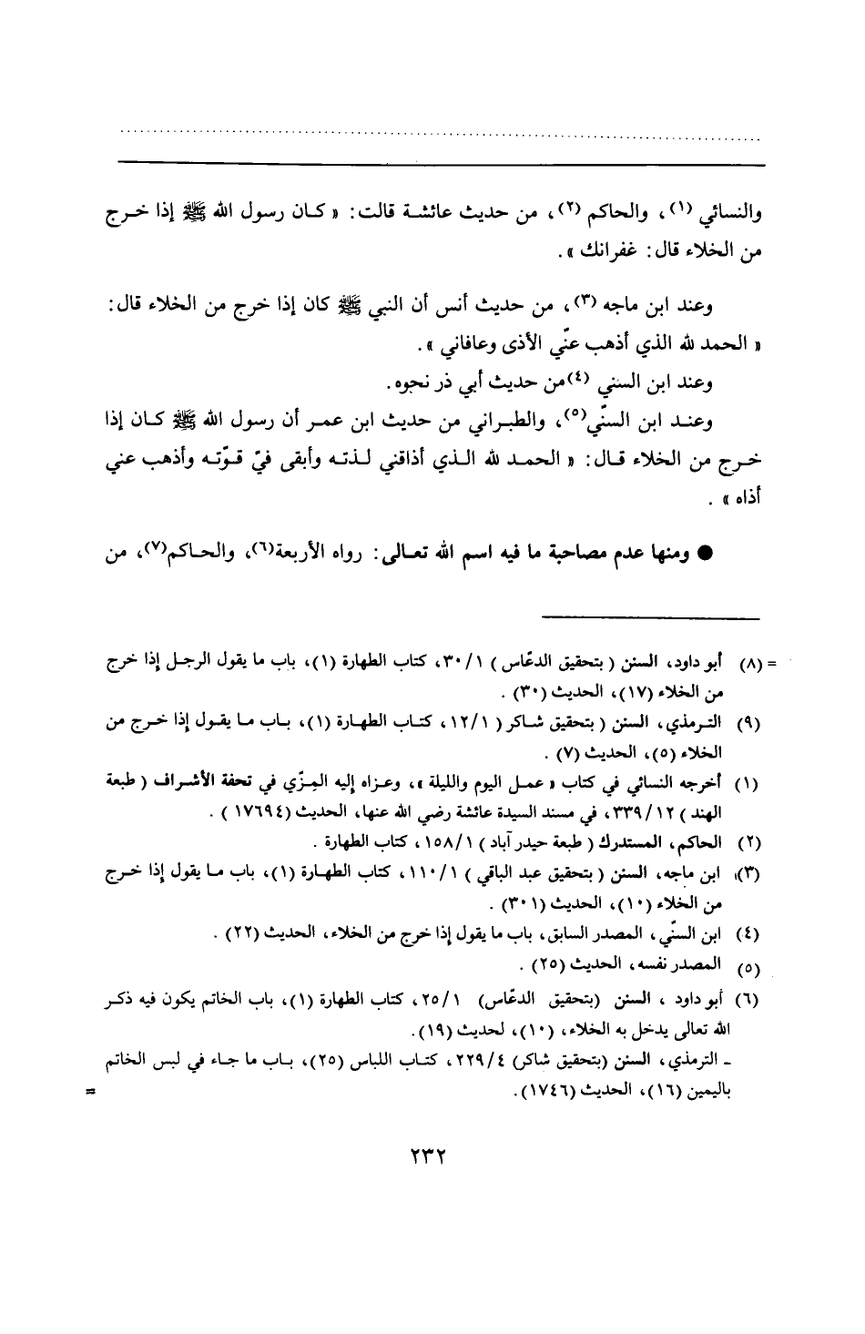 والنسائي، والحاكم، من حديث عائشة قالت: "كان رسول الله - صلى الله عليه وسلم - إذا خرج من الخلاء قال: غفرانك".