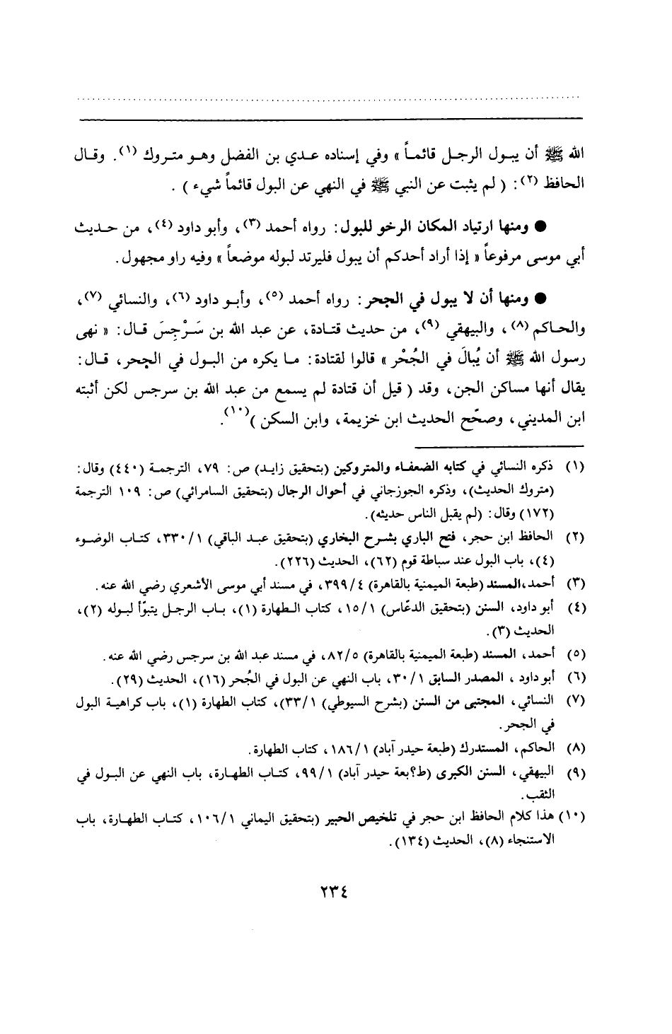 • ومنها أن لا يبول في الجحر: رواه أحمد، وأبو داود، والنسائي، والحاكم، والبيهقي، من حديث قتادة، عن عبد الله بن سَرْجِسَ قال: "نهى رسول الله - صلى الله عليه وسلم - أن يُبالَ في الجُحْر" قالوا لقتادة: ما يكره من البول في الجحر، قال: يقال أنها مساكن الجن، وقد (قيل أن قتادة لم يسمع من عبد الله بن سرجس لكن أثبته ابن المديني، وصحّح الحديث ابن خزيمة، وابن السكن).