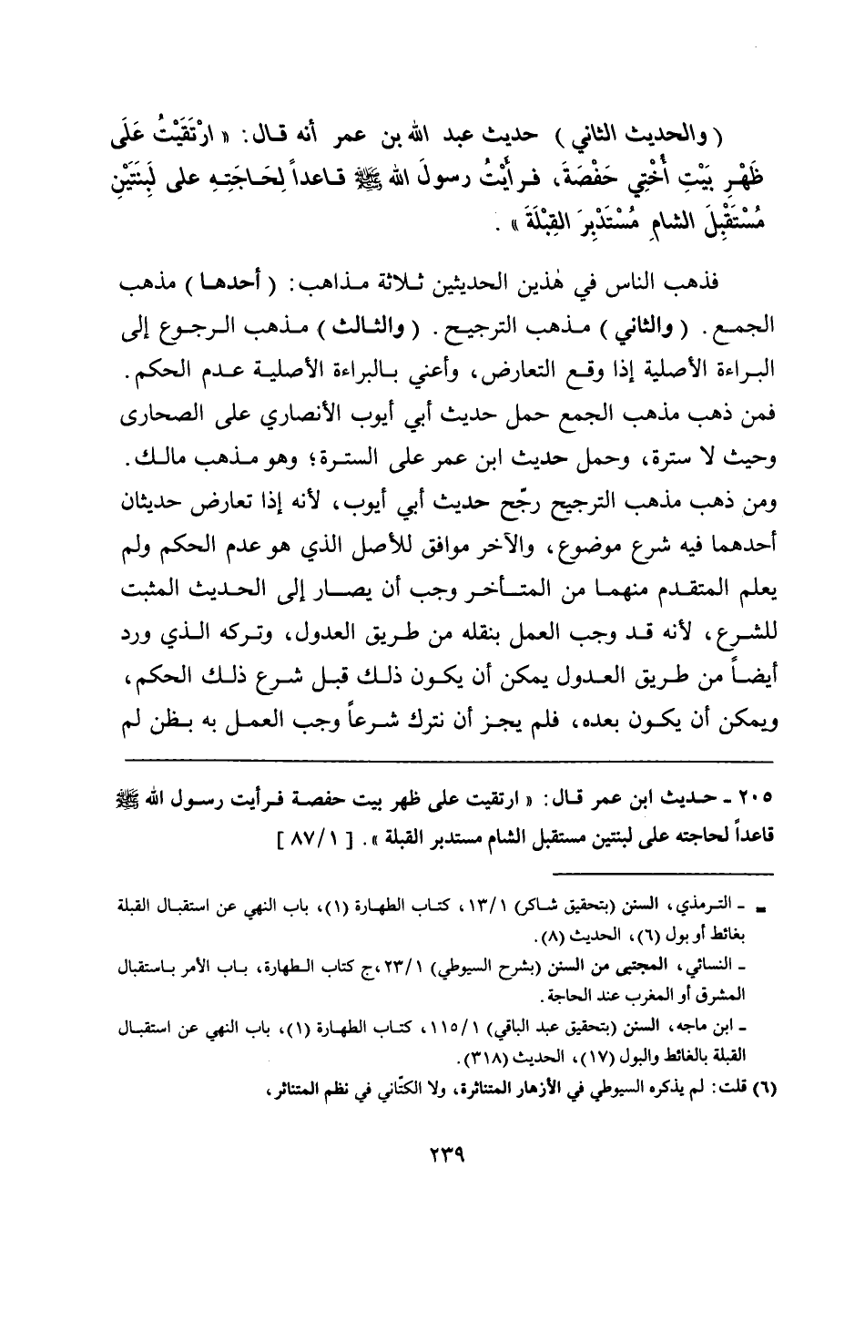 205 - حديث ابن عمر قال: "ارتقيت على ظهر بيت حفصة فرأيت رسول الله - صلى الله عليه وسلم - قاعدًا لحاجته على لبنتين مستقبل الشام مستدبر القبلة".