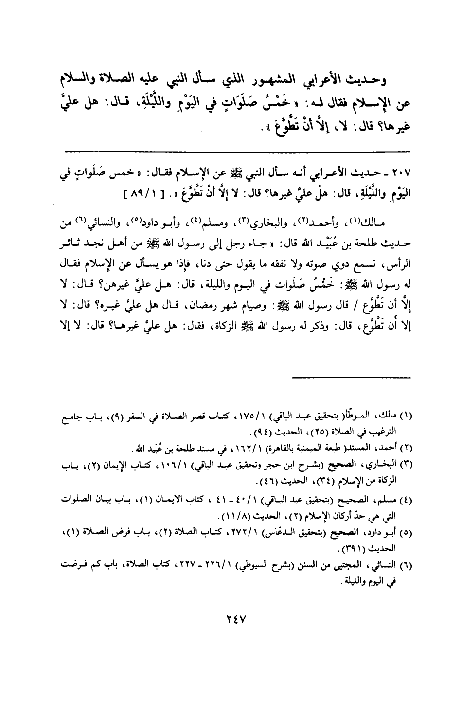 مالك، وأحمد، والبخاري، ومسلم، وأبو داود، والنسائي من حديث طلحة بن عُبَيْد الله قال: "جاء رجل إلى رسول الله - صلى الله عليه وسلم - من أهل نجد ثائر الرأس، نسمع دوي صوته ولا نفقه ما يقول حتى دنا، فإذا هو يسأل عن الإِسلام فقال له رسول الله - صلى الله عليه وسلم -: خَمسُ صَلَوات في اليوم والليلة، قال: هل عليَّ غيرهن؟ قال: لا إلَّا أن تَطَّوَّع قال رسول الله - صلى الله عليه وسلم -: وصيام شهر رمضان، قال هل عليَّ غيره؟ قال: لا إلا أن تَطوَّع، قال: وذكر له رسول الله - صلى الله عليه وسلم - الزكاة، فقال: هل علي غيرها؟ قال: لا إلا