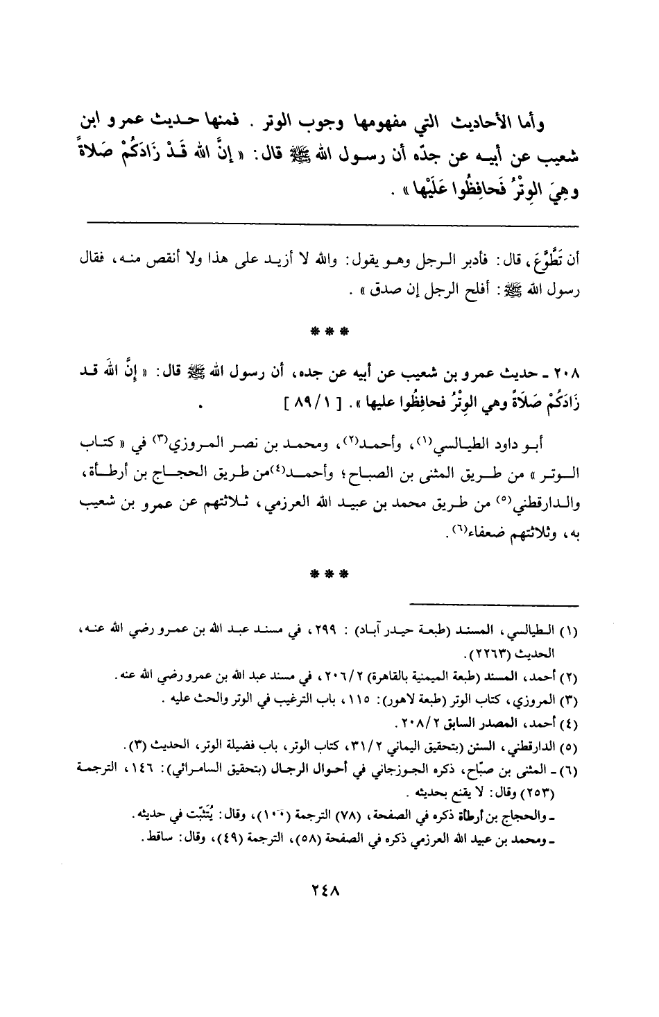 208 - حديث عمرو بن شعيب عن أبيه عن جده، أن رسول الله - صلى الله عليه وسلم - قال: "إِن الله قد زَادَكُمْ صَلاَةً وهي الوِتْرُ فحافِظُوا عليها".