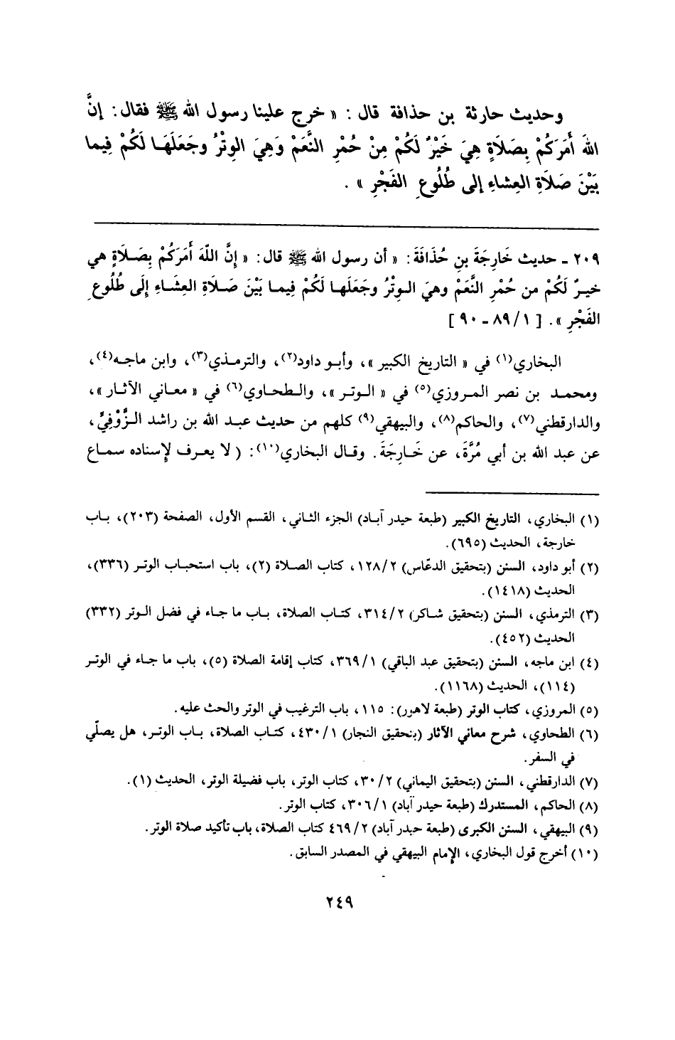 209 - حديث خَارِجَةَ بنِ حُذَافَةَ: "أن رسول الله - صلى الله عليه وسلم - قال: "إِن الله أمَرَكمْ بِصَلاَةٍ هي خيرَ لَكُمْ من حُمْرِ النعَمْ وهي الوِتْرُ وجَعَلَها لَكُمْ فِيما بَيْنَ صلاَةِ العِشَاءِ إلَى طُلُوعِ الفَجْرِ".