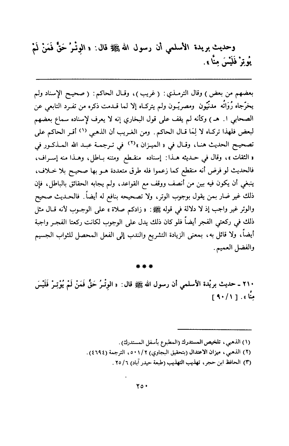 210 - حديث بريْدة الأسلمي أن رسول الله - صلى الله عليه وسلم - قال: "الوِتْرُ حَق فَمَنْ لَمْ يُوْتِرْ فَلَيْسَ مِنا".