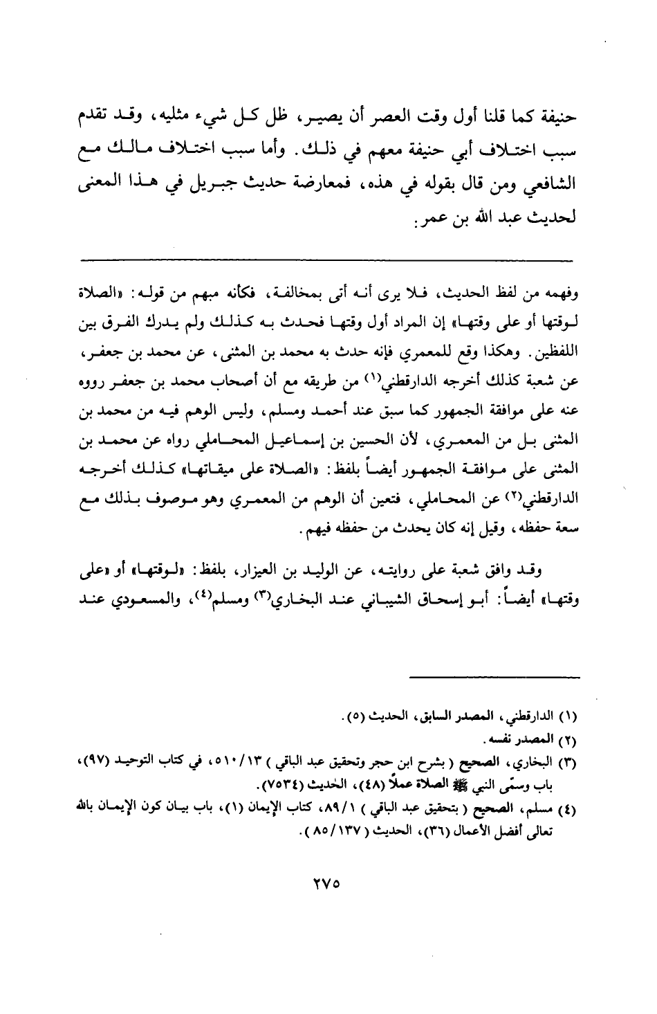 وفهمه من لفظ الحديث، فلا يرى أنه أتى بمخالفة، فكأنه مبهم من قوله: "الصلاة لوقتها أو على وقتها" إن المراد أول وقتها فحدث به كذلك ولم يدرك الفرق بين اللفظين. وهكذا وقع للمعمري فإنه حدث به محمَّد بن المثنى، عن محمَّد بن جعفر، عن شعبة كذلك أخرجه الدارقطني من طريقه مع أن أصحاب محمَّد بن جعفر رووه عنه على موافقة الجمهور كما سبق عند أحمد ومسلم، وليس الوهم فيه من محمد بن المثنى بل من المعمري، لأن الحسين بن إسماعيل المحاملي رواه عن محمَّد بن المثنى على موافقة الجمهور أيضًا بلفظ: "الصلاة على ميقاتها" كذلك أخرجه الدارقطني عن المحاملي، فتعين أن الوهم من المعمري وهو موصوف بذلك مع سعة حفظه، وقيل إنّه كان يحدث من حفظه فيهم.