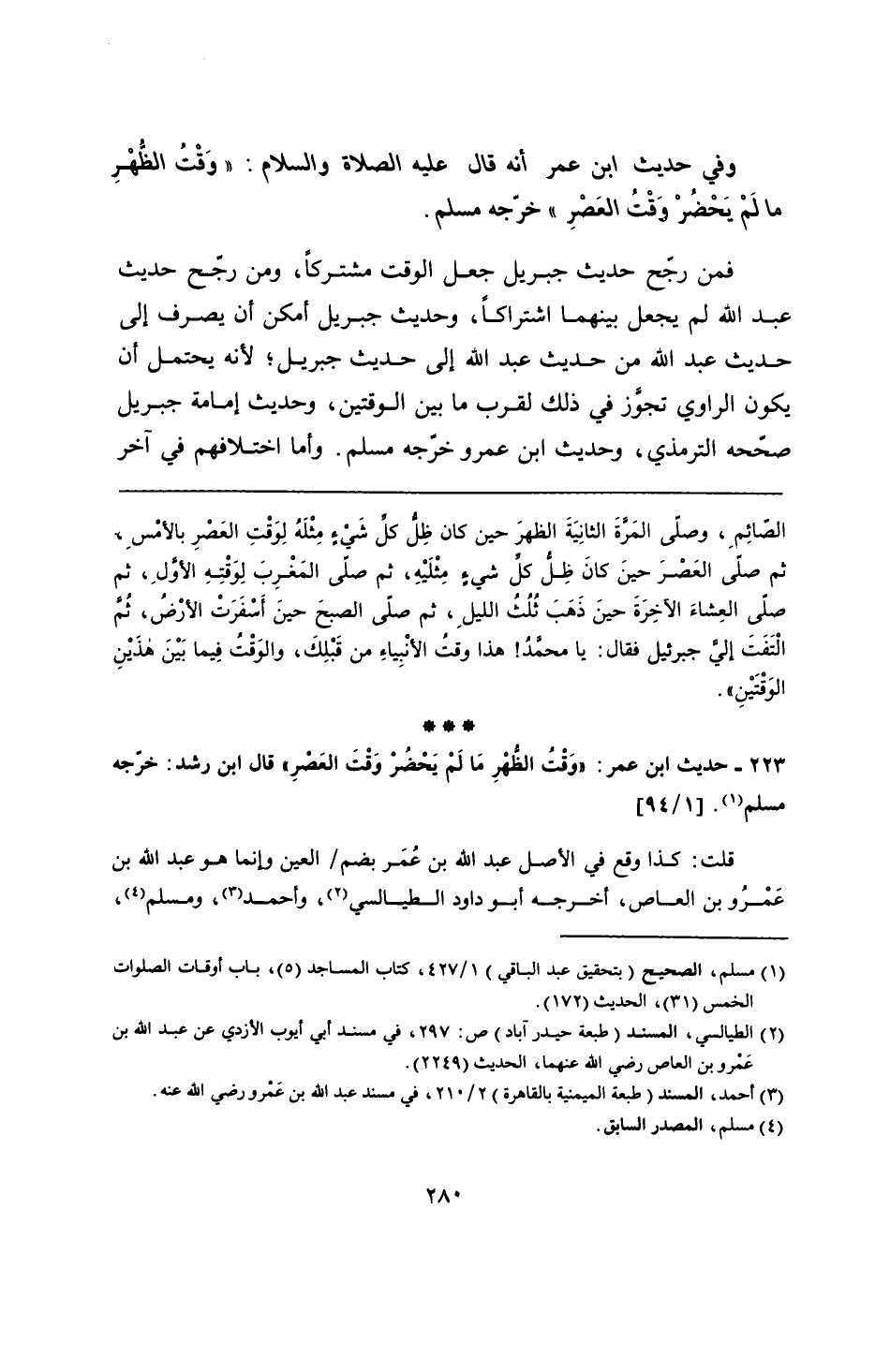 223 - حديث ابن عمر: "وَقْتُ الظهْرِ مَا لَمْ يَحْضُرْ وَقْتَ العَصْرِ" قال ابن رشد: خرّجه مسلم.