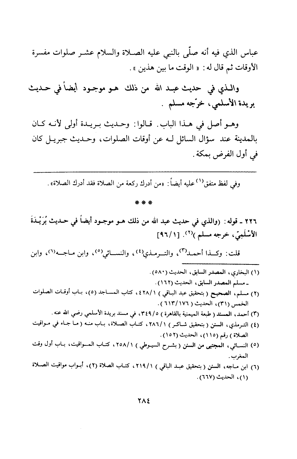 226 - قوله: (والذي في حديث عبد الله من ذلك هو موجود أيضًا في حديث بُرَيْدةَ الأسْلَمِيّ، خرجه مسلم).