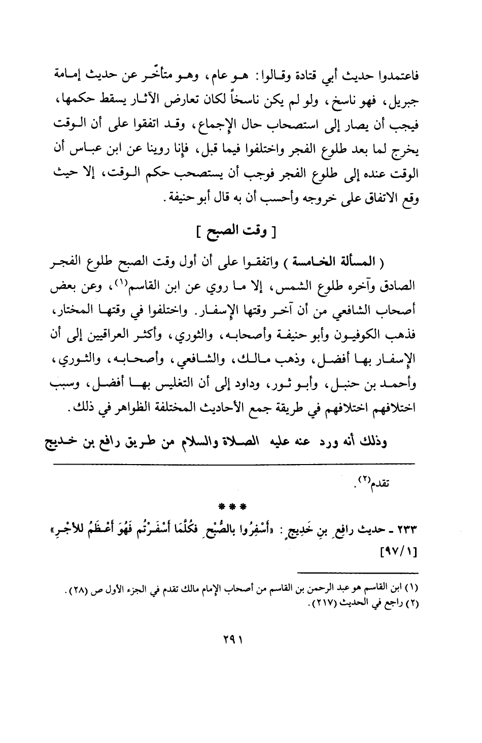 233 - حديث رافِعِ بنِ خَدِيجٍ: "أسْفِروا بالصبْحِ فكُلَّمَا أَسْفَرْتُم فَهُوَ أَعْظَمُ للأجْرِ".