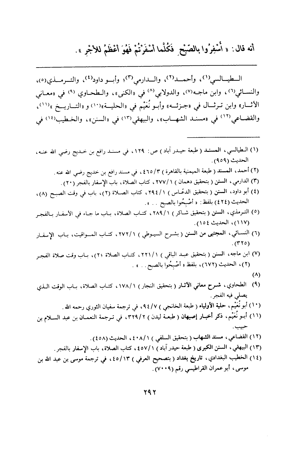 الطيالسي، وأحمد، والدارمي؛ وأبو داود، والترمذي، والنسائي، وابن ماجه، والدولابي في "الكنى"، والطحاوي في "معاني الآثار" وابن ترثال في "جزئه" وأبو نُعَيْم في "الحلية" و"التاريخ"، والقضاعي في "مسند الشهاب"، والبيهقي في "السنن"، والخطيب في