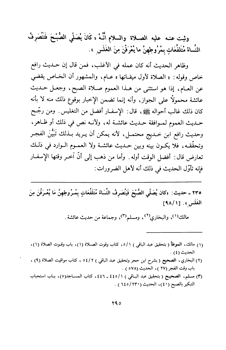 235 - حديث: "كان يُصَلّي الصُّبحَ فَيَنْصَرِفُ النساءُ مُتَلَفعَات بِمُرُوطِهِن مَا يُعْرَفْنَ مِنَ الغَلَسِ".