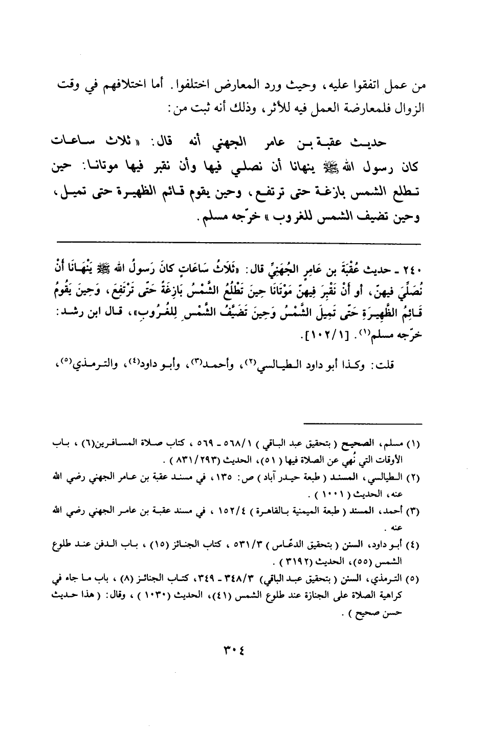 240 - حديث عُقْبَةَ بن عَامِر الجُهَنِي قال: "ثَلَاث سَاعَاتٍ كانَ رَسولُ الله - صلى الله عليه وسلم - يَنْهَانَا أنْ نُصَلِّيَ فيهن، أو أنْ نَقْبِرَ فِيهن مَوْتَانَا حِينَ تَطْلُعُ الشمس بَازِغَةً حَتْى تَرْتَفِعَ، وَحِينَ يَقُومُ قَائِمُ الظهِيرَةِ حَتْى تَمِيلَ الشَّمْسُ وَحِينَ تَضَيف الشمْسِ لِلغُرُوبِ"، قال ابن رشد: خرجه مسلم.