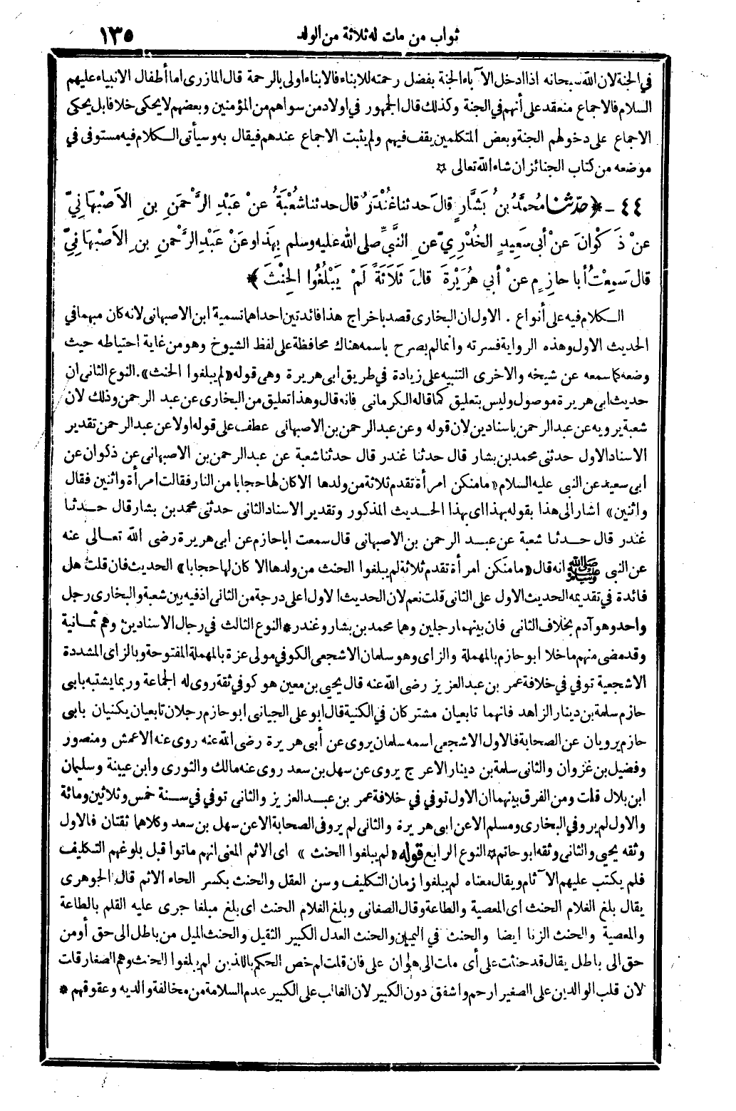 44 - (حَدثنَا مُحَمَّد بن بشار قَالَ حَدثنَا غنْدر قَالَ حَدثنَا شُعْبَة عَن عبد الرَّحْمَن بن الْأَصْبَهَانِيّ عَن ذكْوَان عَن أبي سعيد بن الْخُدْرِيّ عَن النَّبِي صلى الله عَلَيْهِ وَسلم بِهَذَا وَعَن عبد الرَّحْمَن بن الْأَصْبَهَانِيّ قَالَ سَمِعت أَبَا حَازِم عَن أبي هُرَيْرَة قَالَ ثَلَاثَة لم يبلغُوا الْحِنْث) الْكَلَام فِيهِ على أَنْوَاع. الأول أَن البُخَارِيّ قصد بِإِخْرَاج هَذَا فائدتين أَحدهمَا تَسْمِيَة ابْن الْأَصْبَهَانِيّ لِأَنَّهُ كَانَ مُبْهما فِي الحَدِيث الأول وَهَذِه الرِّوَايَة فسرته وَإِنَّمَا لم بصرح باسمه هُنَاكَ مُحَافظَة على لفظ الشُّيُوخ وَهُوَ من غَايَة احتياطه حَيْثُ وَضعه كَمَا سَمعه عَن شَيْخه وَالْأُخْرَى التَّنْبِيه على زِيَادَة فِي طَرِيق أَبُو هُرَيْرَة وَهِي قَوْله " لم يبلغُوا الْحِنْث ". النَّوْع الثَّانِي أَن حَدِيث أبي هُرَيْرَة مَوْصُولَة وَلَيْسَ بتعليق كَمَا قَالَه الْكرْمَانِي فَإِنَّهُ قَالَ وَهَذَا تَعْلِيق من البُخَارِيّ عَن عبد الرَّحْمَن وَذَلِكَ لِأَن شُعْبَة يرويهِ عَن عبد الرَّحْمَن بِإِسْنَادَيْنِ لآن قَوْله وَعَن عبد الرَّحْمَن بن الاصبهاني عطف على قَوْله أَولا عَن عبد الرَّحْمَن تَقْدِير الاسناد الأول حَدثنِي مُحَمَّد بن بشار قَالَ حَدثنَا غنْدر قَالَ حَدثنَا شُعْبَة عَن عبد الرَّحْمَن بن الاصبهاني عَن ذكْوَان عَن أبي سعيد عَن النَّبِي عَلَيْهِ السَّلَام " مَا مِنْكُن امْرأ تَقْدِيم ثَلَاثَة من وَلَدهَا إِلَّا كَانَ لَهَا حِجَابا من النَّار فَقَالَت امْرَأَة واثنين فَقَالَ واثنين " أَشَارَ إِلَى هَذَا بقوله بِهَذَا أَي بِهَذَا الحَدِيث الْمَذْكُور وَتَقْدِير الْإِسْنَاد الثَّانِي حَدثنِي مُحَمَّد بن بشار قَالَ حَدثا غنْدر قَالَ حَدثا شُعْبَة عَن عبد الرَّحْمَن بن الاصبهاني قَالَ سَمِعت أَبَا حَازِم عَن أبي هُرَيْرَة رَضِي الله تَعَالَى عَنهُ عَن النَّبِي صلى الله عَلَيْهِ وَسلم أَنه قَالَ " مَا مِنْكُن امْرَأَة تقدم ثَلَاثَة لم يبلغُوا الْحِنْث من وَلَدهَا إِلَّا كَانَ لَهَا حِجَابا " الحَدِيث فَإِن قلت هَل فَائِدَة فِي تَقْدِيمه الحَدِيث الأول على الثَّانِي قلت نعم لِأَن الحَدِيث الأول أَعلَى دَرَجَة من الثَّانِي اذفيه بَين شُعْبَة وَالْبُخَارِيّ رجل وَاحِد وَهُوَ ابْن آدم بِخِلَاف الثَّانِي فَإِن بَينهمَا رجلَيْنِ وهما مُحَمَّد بن بشار وغندر النَّوْع الثَّالِث فِي رجال الاسنادين وهم ثَمَانِيَة وَقد مضى مِنْهُم ماخلا أَبُو حَازِم بِالْمُهْمَلَةِ وَالزَّاي وَهُوَ سُلَيْمَان الاشجعي الْكُوفِي مولى عزة بِالْمُهْمَلَةِ الْمَفْتُوحَة وبالزاي الْمُشَدّدَة الاشجعية توفّي فِي خلَافَة عمر بن عبد الْعَزِيز رَضِي الله عَنهُ قَالَ يحيى بن معِين هُوَ كُوفِي ثِقَة روى لَهُ الْجَمَاعَة وَرُبمَا يشْتَبه بِأبي حَازِم سَلمَة بن دِينَار الزَّاهِد فَإِنَّهَا تابعيان مشتركان فِي الكنية قَالَ أَبُو عَليّ الجياني أَبُو حَازِم رجلَانِ تابعيان يكنيان بِأبي حَازِم يرويان عَن الصَّحَابَة فَالْأول الاشعي اسْمه سُلَيْمَان يروي عَن أبي هُرَيْرَة رَضِي الله عَنهُ الْأَعْمَش وَمَنْصُور وفضيل بن غَزوَان وَالثَّانِي سَلمَة بن دِينَار الْأَعْرَج يروي عَن سهل بن سعد روى عَنهُ مَالك وَالثَّوْري وَابْن عُيَيْنَة وَسليمَان ابْن بِلَال قلت وَمن الْفرق بَينهمَا أَن الأول توفّي فِي خلَافَة عمر بن عبد الْعَزِيز وَالثَّانِي توفّي فِي سنة خمس وَثَلَاثِينَ وَمِائَة وَالْأول لم يرو فِي البُخَارِيّ وَمُسلم إِلَّا عَن أبي هُرَيْرَة وَالثَّانِي لم يرو فِي الصَّحَابَة إِلَّا عَن سهل بن سعد وَكِلَاهُمَا ثقتان فَالْأول وثقة يحيى وَالثَّانِي وَثَّقَهُ أَبُو حَاتِم النَّوْع الرَّابِع قَوْله " لم يبلغُوا الْحِنْث " أَي الْإِثْم الْمَعْنى أَنهم مَاتُوا قبل بلوغهم التَّكْلِيف فَلم يكْتب 