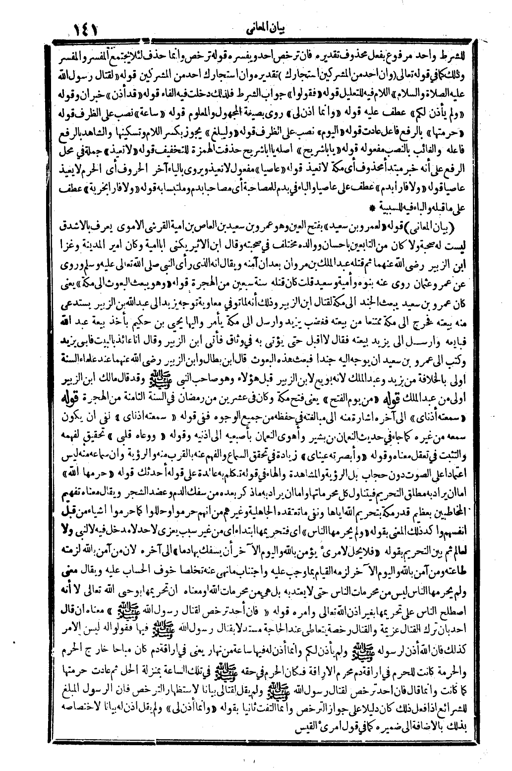 بَيَان الْمعَانِي: قَوْله: (لعَمْرو بن سعيد) ، بِفَتْح الْعين: وَهُوَ عَمْرو بن سعيد بن الْعَاصِ ابْن أُميَّة الْقرشِي الْأمَوِي، يعرف بالأشدق، لَيست لَهُ صُحْبَة وَلَا كَانَ من التَّابِعين باحسان. ووالده مُخْتَلف فِي صحبته. وَقَالَ ابْن الْأَثِير: يكنى أَبَا أُميَّة، وَكَانَ أَمِير الْمَدِينَة، وغزا ابْن الزبير، رَضِي الله عَنْهُمَا، ثمَّ قَتله عبد الْملك بن مَرْوَان بعد أَن آمنهُ. وَيُقَال: إِنَّه الَّذِي رأى النَّبِي صلى الله عَلَيْهِ وَسلم، وروى عَن عمر وَعُثْمَان، روى عَنهُ بنوه وَأُميَّة وَسَعِيد. قلت: كَانَ قَتله سنة سبعين من الْهِجْرَة. قَوْله: (وَهُوَ يبْعَث الْبعُوث إِلَى مَكَّة) يَعْنِي: كَانَ عَمْرو بن سعيد يبْعَث الْجند إِلَى مَكَّة لقِتَال ابْن الزبير، وَذَلِكَ أَنه لما توفّي مُعَاوِيَة توجه يزِيد إِلَى عبد اللَّه بن الزبير يَسْتَدْعِي مِنْهُ بيعَته، فَخرج إِلَى مَكَّة مُمْتَنعا من بيعَته، فعضب يزِيد وَأرْسل إِلَى مَكَّة يَأْمر واليها يحيى بن حَكِيم بِأخذ بيعَة عبد اللَّه، فَبَايعهُ وَأرْسل إِلَى يزِيد بيعَته، فَقَالَ: لَا أقبل حَتَّى يُؤْتى بِهِ فِي وثاق، فَأتى ابْن الزبير، وَقَالَ: أَنا عَائِذ بِالْبَيْتِ، فَأبى يزِيد، وَكتب إِلَى عَمْرو بن سعيد أَن يُوَجه إِلَيْهِ جنداً، فَبعث هَذِه الْبعُوث. قَالَ ابْن بطال: وَابْن الزبير، رَضِي الله عَنْهُمَا، عِنْد عُلَمَاء السّنة أولى بالخلافة من يزِيد وَعبد الْملك لِأَنَّهُ بُويِعَ لِابْنِ الزبير قبل هَؤُلَاءِ، وَهُوَ صَاحب النَّبِي صلى الله عَلَيْهِ وَسلم، وَقد قَالَ مَالك: ابْن الزبير أولى من عبد الْملك. قَوْله: (من يَوْم الْفَتْح) يَعْنِي فتح مَكَّة، وَكَانَ فِي عشْرين من رَمَضَان فِي السّنة الثَّامِنَة من الْهِجْرَة. قَوْله: (سمعته أذناي) إِلَى آخِره، إِشَارَة مِنْهُ إِلَى مبالغته فِي حفظه من جَمِيع الْوُجُوه، فَفِي قَوْله: (سمعته أذناي) نفي أَن يكون سَمعه من غَيره، كَمَا جَاءَ فِي حَدِيث النُّعْمَان بن بشير، وأهوى النُّعْمَان بِأُصْبُعَيْهِ إِلَى أُذُنَيْهِ. وَقَوله: (ووعاه قلبِي) تَحْقِيق لفهمه والتثبت فِي تعقل مَعْنَاهُ. وَقَوله: (وأبصرته عَيْنَايَ) زِيَادَة فِي تحقق السماع والفهم عَنهُ بِالْقربِ مِنْهُ والرؤية، وَأَن سَمَاعه مِنْهُ لَيْسَ اعْتِمَادًا على الصَّوْت دون حجاب، بل الرُّؤْيَة والمشاهدة، وَالْهَاء فِي قَوْله: تكلم بِهِ، عَائِدَة على قَوْله: أحَدثك. قَوْله: (حرمهَا الله) إِمَّا أَن يُرَاد بِهِ مُطلق التَّحْرِيم، فَيتَنَاوَل كل محرماتها، وَإِمَّا أَن يُرَاد بِهِ مَا ذكر بعده من سفك الدَّم وعضد الشّجر. وَيُقَال: مَعْنَاهُ تفهيم المخاطبين بعظيم قدر مَكَّة بِتَحْرِيم الله إِيَّاهَا، وَنفي مَا تعتقده الْجَاهِلِيَّة وَغَيرهم من أَنهم حرمُوا وحللوا، كَمَا حرمُوا أَشْيَاء من قبل أنفسهم، وأكد ذَلِك الْمَعْنى بقوله: (وَلم يحرمها النَّاس) ، أَي: فتحريمها ابْتِدَاء أَي من غير سَبَب يعزى لأحد لَا مدْخل فِيهِ لَا لنَبِيّ وَلَا لعالم، ثمَّ بيّن التَّحْرِيم بقوله: (فَلَا يحل لامرىء يُؤمن بِاللَّه وَالْيَوْم الآخر أَن يسفك بهَا دَمًا) إِلَى آخِره، لِأَن من آمن بِاللَّه لَزِمته طَاعَته، وَمن آمن بِاللَّه وَالْيَوْم الآخر لزمَه الْقيام بِمَا وَجب عَلَيْهِ، وَاجْتنَاب مَا نهى عَنهُ، تخلصاً خوف الْحساب عَلَيْهِ، وَيُقَال: معنى: وَلم يحرمها النَّاس: لَيْسَ من مُحرمَات النَّاس، حَتَّى لَا يعْتد بِهِ، بل هِيَ من مُحرمَات الله. أَو مَعْنَاهُ: إِن تَحْرِيمهَا بِوَحْي الله تَعَالَى، لَا أَنه اصْطلحَ النَّاس على تَحْرِيمهَا بِغَيْر إِذن الله تَعَالَى. قَوْله: (فَإِن أحد ترخص لقِتَال رَسُول الله صلى الله عَلَيْهِ وَسلم) مَعْنَاهُ: إِن قَالَ أحد بِأَن ترك الْقِتَال عَزِيمَة، والقتال رخصَة يتعاطى عِنْد الْحَاجة مستدلاً بِقِتَال رَسُول الله صلى الله عَلَيْهِ وَسلم فِيهَا، فَق