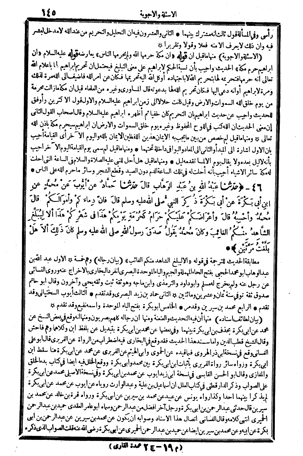 105 - حدّثنا عَبْدُ اللَّهِ بنُ عَبْدِ الوَهَّابِ قالَ: حدّثنا حَمَّادٌ عنْ أيُّوبَ عَنْ مُحمَّدٍ عنِ ابنِ أبي بَكْرَةَ، عنْ أبي بَكْرَةَ ذُكِرَ النبيُّ صلى الله عَلَيْهِ وَسلم قالَ: (فإنّ دِمَاءَكُمْ وأموَالَكُمْ) . قالَ مُحمَّدٌ: وأحْسِبُهُ قالَ: وأعْرَاضَكُمْ: (عَلَيْكُمْ حَرَامٌ كَحُرْمَة يَوْمكُمْ هَذَا فِي شَهْرِكُمْ هَذَا، أَلا لِيُبَلِّغِ الشَّاهِدُ مِنْكُمُ الغَائِبَ) وكانَ مُحَمَّدٌ يَقُولَ: صَدَقَ رسولُ اللَّهِ صلى الله عَلَيْهِ وَسلم، كانَ ذَلِكَ، (ألاَ هَلْ بَلَّغْتُ) . مَرَّتَيْنِ.