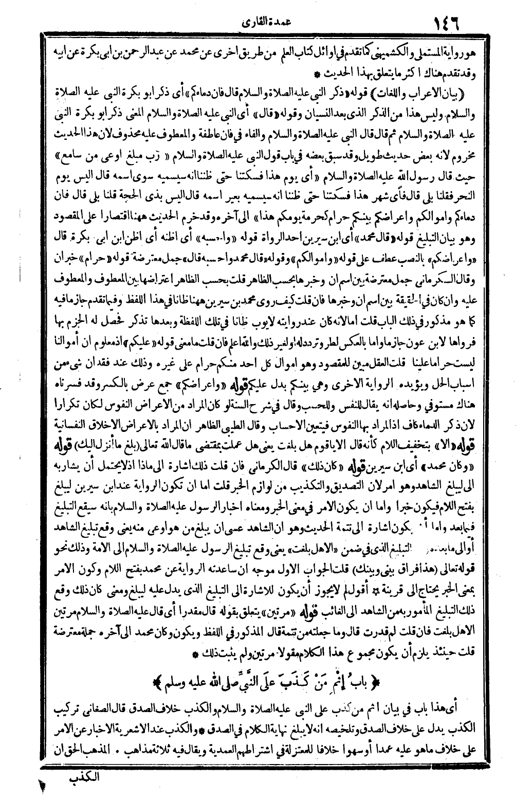 بَيَان الْإِعْرَاب واللغات: قَوْله: (ذكر النَّبِي، عَلَيْهِ الصَّلَاة وَالسَّلَام. قَالَ: فَإِن دماءكم) أَي: ذكر أَبُو بكرَة النَّبِي، عَلَيْهِ الصَّلَاة وَالسَّلَام، وَلَيْسَ هَذَا من الذّكر الَّذِي بعد النسْيَان. وَقَوله: (قَالَ) ، أَي النَّبِي، عَلَيْهِ الصَّلَاة وَالسَّلَام، الْمَعْنى: ذكر أَبُو بكرَة النَّبِي، عَلَيْهِ الصَّلَاة وَالسَّلَام، ثمَّ قَالَ: قَالَ النَّبِي، عَلَيْهِ الصَّلَاة وَالسَّلَام، و: الْفَاء، فِي فَإِن، عاطفة والمعطوف عَلَيْهِ مَحْذُوف، لِأَن هَذَا الحَدِيث مَخْزُوم، لِأَنَّهُ بعض حَدِيث طَوِيل وَقد سبق بعضه فِي بَاب: قَول النَّبِي، عَلَيْهِ الصَّلَاة وَالسَّلَام: (رب مبلغ أوعى من سامع) ، حَيْثُ قَالَ رَسُول الله عَلَيْهِ الصَّلَاة وَالسَّلَام: (أَي يَوْم هَذَا؟ فسكتنا حَتَّى ظننا أَنه سيسميه سوى اسْمه قَالَ: أَلَيْسَ يَوْم النَّحْر؟ فَقُلْنَا: بلَى، قَالَ: فَأَي شهر هَذَا؟ فسكتنا حَتَّى ظننا أَنه سيسميه بِغَيْر اسْمه، قَالَ: أَلَيْسَ بِذِي الْحجَّة؟ قُلْنَا: بلَى. قَالَ: فَإِن دماءكم وَأَمْوَالكُمْ وَأَعْرَاضكُمْ بَيْنكُم حرَام كَحُرْمَةِ يومكم هَذَا) إِلَى آخِرَة، وَقد خرم الحَدِيث هَهُنَا اقتصارا على الْمَقْصُود وَهُوَ بَيَان التَّبْلِيغ. قَوْله: (قَالَ مُحَمَّد) أَي: ابْن سِيرِين أحد الروَاة. قَوْله: (واحسبه) أَي: أَظُنهُ، أَي: أَظن ابْن أبي بكرَة، قَالَ: (وَأَعْرَاضكُمْ) ، بِالنّصب عطف على قَوْله: (وَأَمْوَالكُمْ) . وَقَوله: (قَالَ مُحَمَّد وَأَحْسبهُ قَالَ) ، جمل مُعْتَرضَة. قَوْله: (حرَام) خبر: إِن، وَقَالَ الْكرْمَانِي: جمل مُعْتَرضَة بَين اسْم إِن وخبرها بِحَسب الظَّاهِر. قلت: بِحَسب الظَّاهِر اعتراضها بَين الْمَعْطُوف والمعطوف عَلَيْهِ، وَإِن كَانَ فِي الْحَقِيقَة بَين اسْم إِن وخبرها. فَإِن قلت: كَيفَ روى مُحَمَّد بن سِيرِين هَهُنَا ظَانّا فِي هَذَا اللَّفْظ، وَفِيمَا تقدم جَازَ مَا فِيهِ كَمَا هُوَ مَذْكُور فِي ذَلِك الْبَاب؟ قلت: إِمَّا لِأَنَّهُ كَانَ عِنْد رِوَايَته لأيوب ظَانّا فِي تِلْكَ اللَّفْظَة، وَبعدهَا تذكر فَحصل لَهُ الْجَزْم بهَا، فرواها لِابْنِ عون جَازِمًا. وَإِمَّا بِالْعَكْسِ لطرو تردد لَهُ أَو لغير ذَلِك، وَالله أعلم. فَإِن قلت: مَا معنى قَوْله: (عَلَيْكُم) إِذْ مَعْلُوم أَن أَمْوَالنَا لَيست حَرَامًا علينا؟ قلت: الْعقل مُبين للمقصود وَهُوَ: أَمْوَال كل أحد مِنْكُم حرَام على غَيره، وَذَلِكَ عِنْد فقدان شَيْء من أَسبَاب الْحل، وَيُؤَيِّدهُ الرِّوَايَة الْأُخْرَى: وَهِي بَيْنكُم بدل: عَلَيْكُم. قَوْله: (وَأَعْرَاضكُمْ) جمع عرض بِالْكَسْرِ، وَقد فسرناه هُنَاكَ مُسْتَوفى. وَحَاصِله أَنه يُقَال للنَّفس وللحسب. وَقَالَ فِي (شرح السّنة) لَو كَانَ المُرَاد من الْأَعْرَاض النُّفُوس لَكَانَ تَكْرَارا، لِأَن ذكر الدِّمَاء كافٍ، إِذْ المُرَاد بهَا النُّفُوس فَيتَعَيَّن الأحساب. وَقَالَ الطَّيِّبِيّ: الظَّاهِر أَن المُرَاد بالأعراض: الْأَخْلَاق النفسانية. قَوْله: (أَلا) ، بتَخْفِيف اللَّام، كَأَنَّهُ قَالَ: ألاَ يَا قوم هَل بلغت؟ يَعْنِي: هَل عملت بِمُقْتَضى مَا قَالَ الله تَعَالَى: {بلغ مَا أنزل إِلَيْك} (الْمَائِدَة: 67) ؟ قَوْله: (وَكَانَ مُحَمَّد) ، أَي: ابْن سِيرِين. قَوْله: (كَانَ ذَلِك) ، قَالَ الْكرْمَانِي: فَإِن قلت: ذَلِك إِشَارَة إِلَى مَاذَا؟ إِذْ لَا يحْتَمل أَن يشار بِهِ إِلَى: ليبلغ الشَّاهِد، وَهُوَ أَمر، لِأَن التَّصْدِيق والتكذيب من لَوَازِم الْخَبَر. قلت: إِمَّا أَن تكون الرِّوَايَة عِنْد ابْن سِيرِين: ليبلغ، بِفَتْح اللَّام فَيكون خَبرا، وَإِمَّا أَن يكون الْأَمر فِي معنى الْخَبَر، وَمَعْنَاهُ: إِخْبَار الرَّسُول، عَلَيْهِ الصَّلَاة وَالسَّلَام، بِأَنَّهُ سيقع التَّبْلِيغ فِيمَا بعد. وَإِمَّا أَن يكون إِشَارَة إِلَى تَتِمَّة الحَدِيث، وَهُوَ: أَن الشَّاهِد عَس