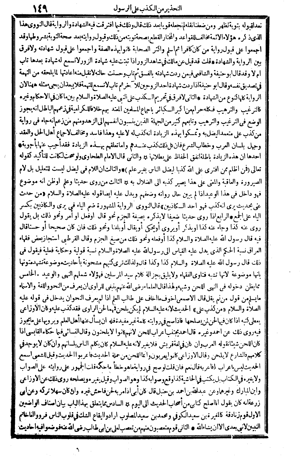 الثَّانِي: لَا فرق فِي تَحْرِيم الْكَذِب على النَّبِي عَلَيْهِ الصَّلَاة وَالسَّلَام، بَين مَا كَانَ فِي الْأَحْكَام وَغَيره: كالترغيب والترهيب. فكله حرَام من أكبر الْكَبَائِر بِإِجْمَاع الْمُسلمين المعتد بهم، خلافًا اللكرامية فِي زعمهم الْبَاطِل أَنه يجوز الْوَضع فِي التَّرْغِيب والترهيب، وتابعهم كثير من الجهلة الَّذين ينسبون أنفسهم إِلَى الزّهْد. وَمِنْهُم من زعم أَنه جَاءَ فِي رِوَايَة: من كذب عَليّ مُتَعَمدا ليضل بِهِ، وتمسكوا بِهَذِهِ الزِّيَادَة: أَنه كذب لَهُ لَا عَلَيْهِ، وَهَذَا فَاسد ومخالف لإِجْمَاع أهل الْحل وَالْعقد، وَجَهل لِسَان الْعَرَب، وخطاب الشَّرْع. فَإِن كل ذَلِك كذب عِنْدهم. وَأما تعلقهم بِهَذِهِ الزِّيَادَة فقد أُجِيب عَنْهَا بأجوبة: أَحدهَا: أَن الزِّيَادَة بَاطِلَة اتّفق الْحفاظ على بُطْلَانهَا. وَالثَّانِي: قَالَ الإِمَام الطَّحَاوِيّ: وَلَو صحت لكَانَتْ للتَّأْكِيد، كَقَوْلِه تَعَالَى: {فَمن أظلم مِمَّن افترى على الله كذبا ليضل النَّاس بِغَيْر علم} (الْأَنْعَام: 144) . وَالثَّالِث: أَن اللَّام فِي: ليضل، لَيست للتَّعْلِيل، بل لَام الصيرورة وَالْعَاقبَة، وَالْمعْنَى: على هَذَا يصير كذبه إِلَى الضلال بِهِ.