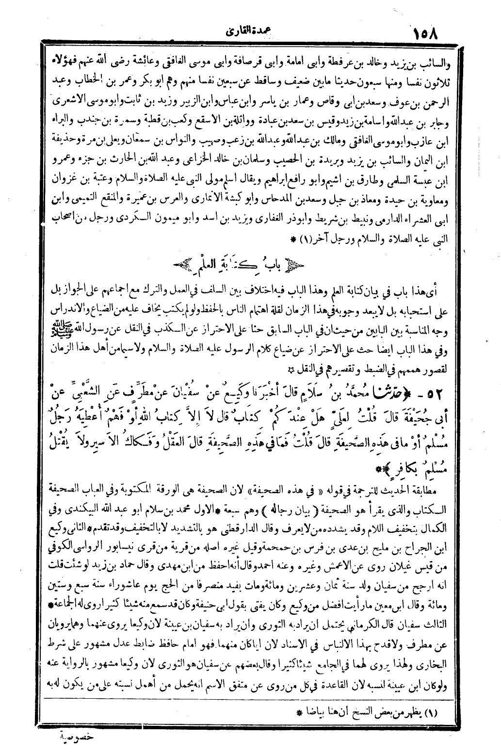 111 - حدّثنا مُحَمَّدُ بنِ سَلاَمٍ قالَ: أخْبَرَنَا وَكِيعٌ عنْ سُفْيَانَ عنْ مطَرِّفٍ عَنِ الشَّعْبِي عنْ أبي جُحَيْفَةَ قالَ: قُلْتُ لِعَليٍ: هَلْ عِنْدَكُمْ كِتَابٌ؟ قَالَ: لاَ! إلاَّ كِتابُ اللَّهِ، أوْ فَهْمٌ أُعْطِيَهُ رَجُلٌ مُسْلمٌ، أوْ مَا فِي هَذِهِ الصَّحِيفَةِ. قالَ: قُلْتُ: فَمَا فِي هَذِهِ الصَّحِيفَةِ؟ قالَ: العَقْلُ، وَفَكاكُ الأسِير ولاَ يُقْتلُ مُسْلِمٌ بكافِرٍ..