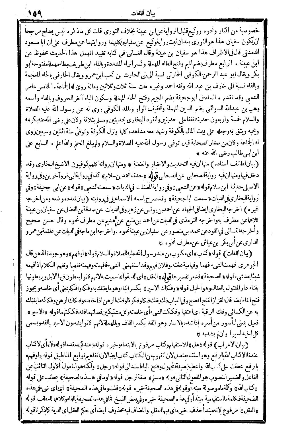 خُصُوصِيَّة من إكثار وَنَحْوه، ووكيع قَلِيل الرِّوَايَة عَن ابْن عُيَيْنَة بِخِلَاف الثَّوْريّ. قلت: كل مَا ذكره لَيْسَ يصلح مرجحا أَن يكون سُفْيَان هَذَا هُوَ الثَّوْريّ، بعد أَن ثَبت رِوَايَة وَكِيع عَن سفيانين كليهمَا وروايتهما عَن مطرف، على أَن أَبَا مَسْعُود الدِّمَشْقِي قَالَ فِي (الْأَطْرَاف) هَذَا هُوَ سُفْيَان بن عُيَيْنَة. وَقَالَ الغساني فِي كِتَابه (تَقْيِيد المهمل) هَذَا الحَدِيث مَحْفُوظ عَن ابْن عُيَيْنَة. الرَّابِع: مطرف، بِضَم الْمِيم وَفتح الطَّاء الْمُهْملَة وَكسر الرَّاء الْمُشَدّدَة وبالفاء: ابْن طريف، بطاء مُهْملَة مَفْتُوحَة: أَبُو بكر، وَيُقَال: أَبُو عبد الرَّحْمَن، الْكُوفِي الْحَارِثِيّ نِسْبَة إِلَى بني الْحَارِث بن كَعْب بن عَمْرو، وَيُقَال: الخارفي، بِالْخَاءِ الْمُعْجَمَة وبالفاء، نِسْبَة إِلَى خارف بن عبد الله. وَثَّقَهُ أَحْمد وَغَيره، مَاتَ سنة ثَلَاث وَثَلَاثِينَ وَمِائَة، روى لَهُ الْجَمَاعَة. الْخَامِس: عَامر الشّعبِيّ، وَقد تقدم. السَّادِس: أَبُو جُحَيْفَة، بِضَم الْجِيم وَفتح الْحَاء الْمُهْملَة وَسُكُون الْيَاء آخر الْحُرُوف وبالفاء، واسْمه وهب بن عبد الله السوَائِي، بِضَم السِّين الْمُهْملَة وَتَخْفِيف الْوَاو وبالمد، الْكُوفِي. رُوِيَ لَهُ عَن رَسُول الله، عَلَيْهِ الصَّلَاة وَالسَّلَام، خَمْسَة وَأَرْبَعُونَ حَدِيثا، اتفقَا على حديثين، وَانْفَرَدَ البُخَارِيّ بحديثين، وَمُسلم بِثَلَاثَة. وَكَانَ عَليّ، رَضِي الله عَنهُ، يُكرمهُ وَيُحِبهُ ويثق بِهِ وَجعله على بَيت المَال بِالْكُوفَةِ، وَشهد مَعَه مشاهده كلهَا وَنزل الْكُوفَة، وَتُوفِّي سنة اثْنَتَيْنِ وَسبعين، روى لَهُ الْجَمَاعَة، وَكَانَ من صغَار الصَّحَابَة. قيل: توفّي رَسُول الله، عَلَيْهِ الصَّلَاة وَالسَّلَام، وَلم يبلغ الْحلم، وَالله أعلم. السَّابِع: عَليّ بن أبي طَالب، رَضِي الله عَنهُ.