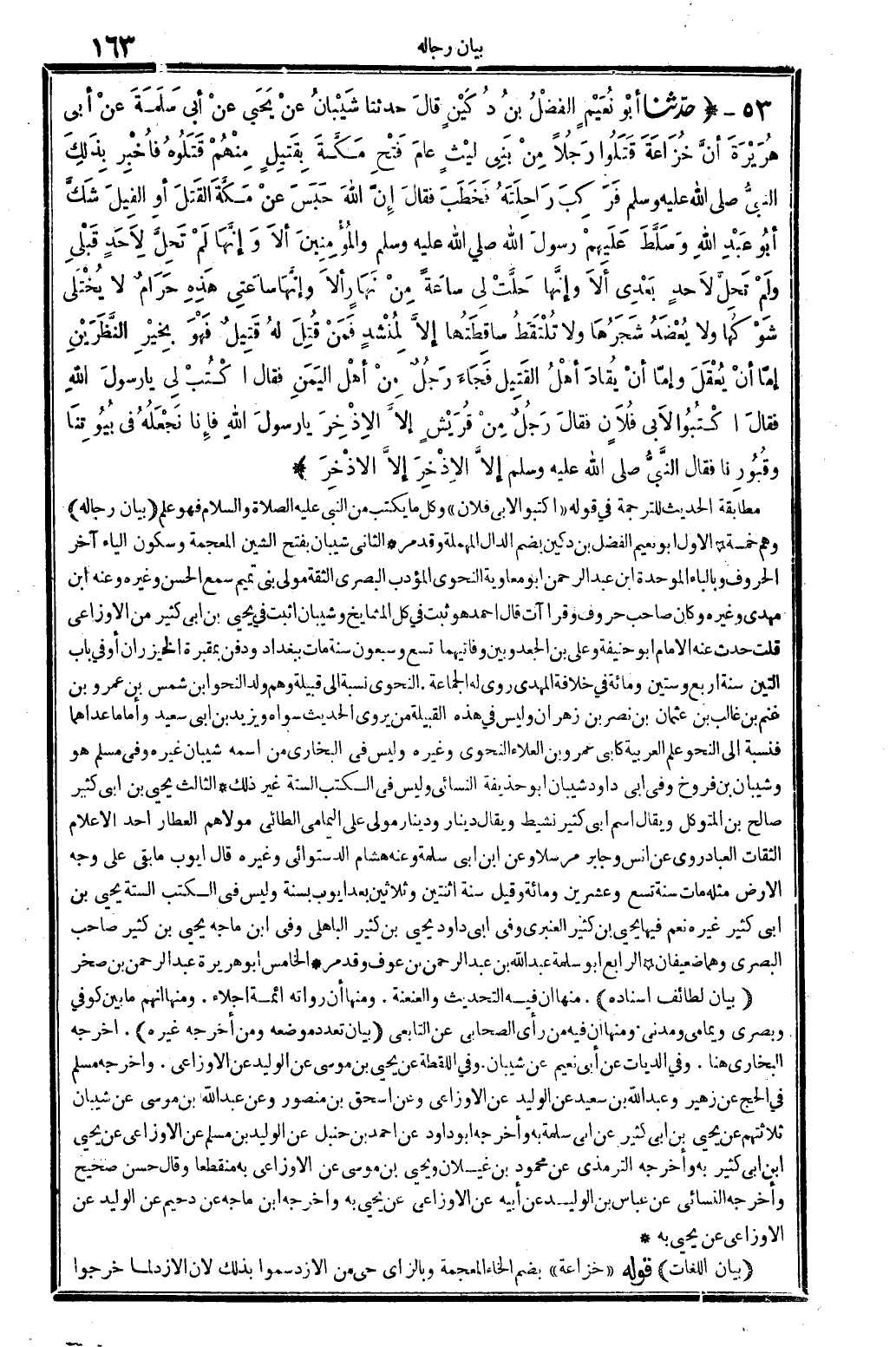 112 - حدّثنا أَبُو نُعَيْمٍ الفضْلُ بنُ دُكَيْنٍ قَالَ: حَدثنَا شَيْبَانُ عنْ يَحيَى عنْ أبي سَلَمَةَ عنْ أبي هُرَيْرَةَ أنَّ خُزَاعَةَ قَتَلُوا رَجُلاً مِنْ بَنِي ليْثٍ عامَ فَتْحِ مَكَّةَ بِقَتِيلٍ مِنْهُمْ قَتَلُوهُ، فأُخْبِر بِذَلِكَ النبيُّ صلى الله عَلَيْهِ وَسلم فَرَكِبَ رَاحِلَتَهُ فَخَطَبَ فقالَ: (إنَّ اللَّهَ حَبَسَ عنْ مكَّةَ القَتلَ) أَو الفِيلَ شَكَّ أبُو عَبْدِ اللَّهِ، وَسَلَّطَ عَلَيْهِمْ رَسُول الله صلى الله عَلَيْهِ وَسلم والمُؤْمِنِينَ، ألاَ وَإنها لَمْ تَحِلَّ لأَحَدٍ قَبْلِي ولَمْ تَحِلَّ لأَحدٍ بَعْدِي ألاَ وإنَّها حَلَّتْ لِي ساعَةً مِنْ نَهَارٍ، ألاَ وإنَّهَا ساعَتِي هَذِهِ حَرَامٌ لَا يُخْتَلَى شَوْكُها وَلَا يُعُضَدُ شَجَرُهَا وَلَا تُلْتَقطُ ساقِطَتُها إلاَّ لِمُنْشدٍ، فَمَنْ قُتِلَ لهُ قَتِيلٌ فَهُوَ بِخيْرِ النَّظَرَيْنِ: إمّا أَن يُعْقَلَ، وإمّا أَن يُقادَ أهْلُ القَتِيل) فَجَاءَ رَجُلٌ مِنْ أهْل اليَمَنِ فَقَالَ: اكْتُبْ لي يَا رسولَ اللَّهِ. فقالَ: (اكْتُبُوا لأبي فُلاَنٍ) فقالَ رَجُلٌ مِنْ قُرَيْشٍ: إلاَّ الإذْخِرَ يَا رسولَ الله فَإنَّا نَجْعَلُهُ فِي بُيُوتِنَا وَقُبُورِنا فَقَالَ النَّبيُّ صلى الله عَلَيْهِ وَسلم إلاَّ الإذْخرِ (إلاَّ الإذْخِرَ) .