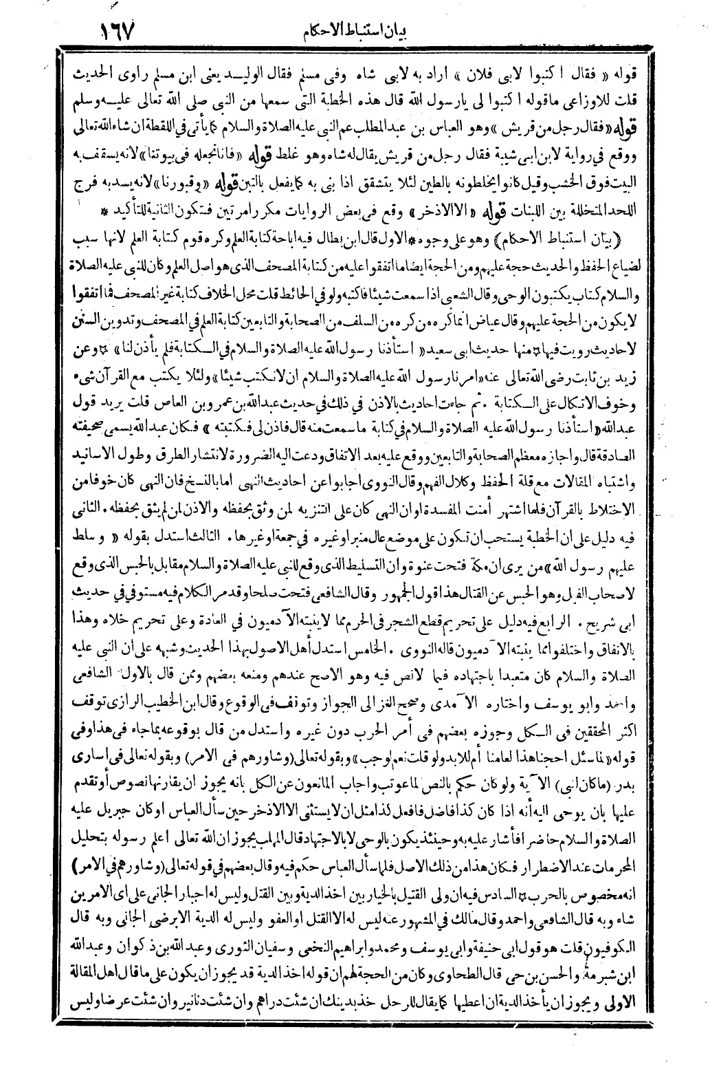 بَيَان استنباط الْأَحْكَام: وَهُوَ على وُجُوه. الأول: قَالَ ابْن بطال: فِيهِ إِبَاحَة كِتَابَة الْعلم، وَكره قوم كِتَابَة الْعلم لِأَنَّهَا سَبَب لضياع الْحِفْظ، والْحَدِيث حجَّة عَلَيْهِم. وَمن الْحجَّة أَيْضا مَا اتَّفقُوا عَلَيْهِ من كِتَابَة الْمُصحف الَّذِي هُوَ أصل الْعلم، وَكَانَ للنَّبِي، عَلَيْهِ الصَّلَاة وَالسَّلَام، كتَّاب يَكْتُبُونَ الْوَحْي. وَقَالَ الشّعبِيّ: إِذا سَمِعت شَيْئا فاكتبه وَلَو فِي الْحَائِط. قلت: مَحل الْخلاف كِتَابَة غير الْمُصحف، فَمَا اتَّفقُوا لَا يكون من الْحجَّة عَلَيْهِم. وَقَالَ عِيَاض: إِنَّمَا كره من كره من السّلف من الصَّحَابَة وَالتَّابِعِينَ كِتَابَة الْعلم فِي الْمُصحف وَتَدْوِين السّنَن لأحاديث رويت فِيهَا. مِنْهَا: حَدِيث أبي سعيد: (استأذنا رَسُول الله، عَلَيْهِ الصَّلَاة وَالسَّلَام، فِي الْكِتَابَة فَلم يَأْذَن لنا) . وَعَن زيد بن ثَابت، رَضِي الله تَعَالَى عَنهُ: (أمرنَا رَسُول الله، عَلَيْهِ الصَّلَاة وَالسَّلَام، أَن لَا نكتب شَيْئا) . وَلِئَلَّا يكْتب مَعَ الْقُرْآن شَيْء وَخَوف الاتكال على الْكِتَابَة. ثمَّ جَاءَت أَحَادِيث بِالْإِذْنِ فِي ذَلِك فِي حَدِيث عبد الله بن عَمْرو بن الْعَاصِ. قلت: يُرِيد قَول عبد الله: (استأذنا رَسُول الله، عَلَيْهِ الصَّلَاة وَالسَّلَام، فِي كِتَابَة مَا سَمِعت مِنْهُ، قَالَ: فَأذن لي، فكتبته) فَكَانَ عبد الله يُسَمِّي صَحِيفَته الصادقة. قَالَ: وَأَجَازَهُ مُعظم الصَّحَابَة وَالتَّابِعِينَ، وَوَقع عَلَيْهِ بعد الِاتِّفَاق ودعت إِلَيْهِ الضَّرُورَة لانتشار الطّرق وَطول الْأَسَانِيد واشتباه المقالات مَعَ قلَّة الْحِفْظ وكلال الْفَهم. وَقَالَ النَّوَوِيّ: أجابوا عَن أَحَادِيث النَّهْي إِمَّا بالنسخ، فَإِن النَّهْي كَانَ خوفًا من الِاخْتِلَاط بِالْقُرْآنِ، فَلَمَّا اشْتهر أمنت الْمفْسدَة، أَو إِن النَّهْي كَانَ على التَّنْزِيه لمن وثق بحفظه، وَالْإِذْن لمن لم يَثِق بحفظه.