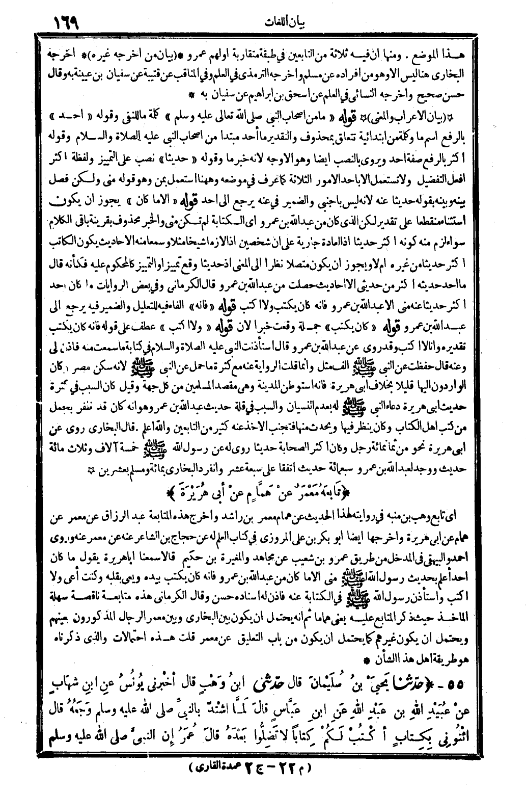 هَذَا الْموضع. مِنْهَا أَن فِيهِ ثَلَاثَة من التَّابِعين فِي طبقَة مُتَقَارِبَة أَوَّلهمْ عَمْرو (بَيَان من أخرجه غَيره) أخرجه البُخَارِيّ هُنَا لَيْسَ إِلَّا هُوَ من أَفْرَاده عَن مُسلم وَأخرجه التِّرْمِذِيّ فِي الْعلم وَفِي المناقب عَن قُتَيْبَة عَن سُفْيَان بن عُيَيْنَة بِهِ وَقَالَ حسن صَحِيح وَأخرجه النَّسَائِيّ فِي الْعلم وَفِي المناقب عَن قُتَيْبَة عَن سُفْيَان بن عُيَيْنَة بِهِ وَقَالَ حسن صَحِيح وَأخرجه النَّسَائِيّ فِي الْعلم عَن اسحق بن إِبْرَاهِيم عَن سُفْيَان بِهِ (بَيَان الاعراب وَالْمعْنَى) قَوْله " مَا من أَصْحَاب النَّبِي صلى الله عَلَيْهِ وَسلم) كلمة مَا للنَّفْي وَقَوله " أحد " بِالرَّفْع اسْم مَا وَكلمَة من ابتدائية تتَعَلَّق بِمَحْذُوف وَالتَّقْدِير مَا أحد مُبْتَدأ من أَصْحَاب النَّبِي صلى الله عَلَيْهِ وَسلم وَقَوله أَكثر بِالرَّفْع صفة أحد ويروي بِالنّصب أَيْضا وَهُوَ إِلَّا وَجه لِأَنَّهُ خبر مَا وَقَوله " حَدِيثا " نصب على التَّمْيِيز وَلَفْظَة أَكثر افْعَل التَّفْضِيل وَلَا تسْتَعْمل إِلَّا بِأحد الْأُمُور الثَّلَاثَة كَمَا عرف فِي مَوْضِعه وَهَهُنَا اسْتعْمل بِمن وَهُوَ قَوْله منى وَلَكِن فصل بَينه وَبَينه بقوله حَدِيثا عَنهُ لِأَنَّهُ لَيْسَ باجنبي وَالضَّمِير فِي عَنهُ يرجع إِلَى أحد قَوْله " إِلَّا مَا كَانَ " يجوز أَن يكون اسْتثِْنَاء مُنْقَطِعًا على تَقْدِير لَكِن الَّذِي كَانَ من عبد الله بن عَمْرو أَي الْكِتَابَة لم تكن منى وَالْخَبَر مَحْذُوف بقرينه بَاقِي الْكَلَام سَوَاء لزم مِنْهُ كَونه أَكثر حَدِيثا إِذا الْعَادة جَارِيَة على أَن شَخْصَيْنِ إِذا لَازِما شَيخا مثلا وَسَمعنَا مِنْهُ الْأَحَادِيث يكون الْكَاتِب أَكثر حَدِيثا من غَيره أم لَا يجوز أَن يكون مُتَّصِلا نظرا إِلَى الْمَعْنى إِذْ حَدِيثا إِذْ وَقع تمييزاً والتمييز كالمحكوم عَلَيْهِ فَكَأَنَّهُ قَالَ مَا أحد حَدِيثه أَكثر من حَدِيثي إِلَّا أَحَادِيث حصلت من عبد الله بن عَمْرو قَالَ الْكرْمَانِي وَفِي بعض الرِّوَايَات مَا كَانَ أحد أَكثر حَدِيثا عَنهُ منى إِلَّا عبد الله بن عَمْرو فَإِنَّهُ كَانَ يكْتب وَلَا أكتب قَوْله " فَإِنَّهُ " الْفَاء فِيهِ للتَّعْلِيل وَالضَّمِير فِيهِ يرجع إِلَى عبد الله بن عَمْرو قَوْله " كَانَ يكْتب " جملَة وَقعت خَبرا لَان قَوْله " وَلَا أكتب " عطف على قَوْله فَإِنَّهُ كَانَ يكْتب تَقْدِيره وَأَنا لَا أكتب وَقد روى عَن عبد الله بن عَمْرو قَالَ اسْتَأْذَنت النَّبِي عَلَيْهِ الصَّلَاة وَالسَّلَام فِي كِتَابَة مَا سَمِعت مِنْهُ فَأذن لي وَعنهُ قَالَ حفظت عَن النَّبِي صلى الله عَلَيْهِ وَسلم ألف مثل وَإِنَّمَا قلت الرِّوَايَة عَنهُ مَعَ كَثْرَة مَا حمل عَن النَّبِي صلى الله عَلَيْهِ وَسلم لِأَنَّهُ سكن مصر وَكَانَ الواردون إِلَيْهَا قَلِيلا بِخِلَاف أبي هُرَيْرَة فَإِنَّهُ استوطن الْمَدِينَة وَهِي مقصد الْمُسلمين من كل جِهَة وَقيل كَانَ السَّبَب فِي كَثْرَة حَدِيث أبي هُرَيْرَة دُعَاء النَّبِي صلى الله عَلَيْهِ وَسلم لَهُ بِعَدَمِ النسْيَان وَالسَّبَب فِي قلَّة حَدِيث عبد الله بن عَمْرو هُوَ أَنه كَانَ قد ظفر بجمل من كتب أهل الْكتاب وَكَانَ ينظر فِيهَا وَيحدث مِنْهَا فتجنب الْأَخْذ عَنهُ كثير من التَّابِعين وَالله أعلم. قَالَ البُخَارِيّ روى عَن أبي هُرَيْرَة نَحْو من ثَمَانمِائَة رجل وَكَانَ أَكثر الصَّحَابَة حَدِيثا روى لَهُ عَن رَسُول الله صلى الله عَلَيْهِ وَسلم خَمْسَة آلَاف وَثَلَاث مائَة حَدِيث وَوجد لعبد الله بن عَمْرو سَبْعمِائة حَدِيث اتفقَا على سَبْعَة عشر وَانْفَرَدَ البُخَارِيّ بِمِائَة وَمُسلم بِعشْرين