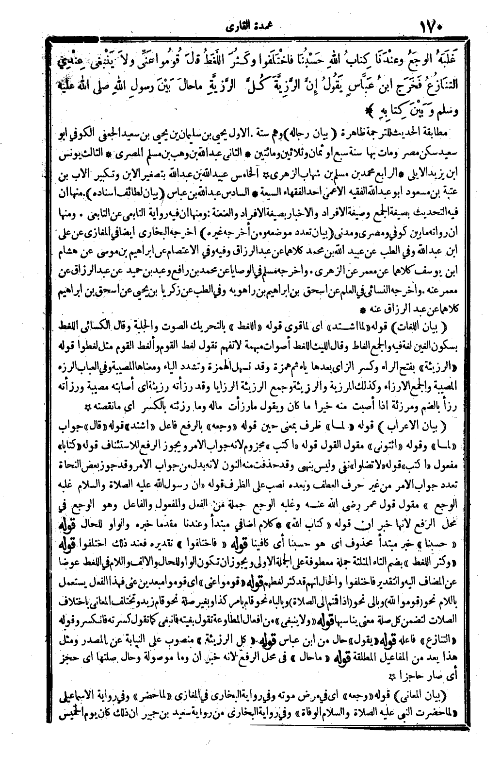 بَيَان الْإِعْرَاب: قَوْله: (لما) ظرف بِمَعْنى: حِين. قَوْله: (وَجَعه) بِالرَّفْع فَاعل: (اشْتَدَّ) . قَوْله: (قَالَ) جَوَاب (لما) وَقَوله: (ائْتُونِي) مقول القَوْل. قَوْله: (اكْتُبْ) مجزوم لِأَنَّهُ جَوَاب الْأَمر، وَيجوز الرّفْع للاستئناف. قَوْله: (كتابا) مفعول: (اكْتُبْ) . قَوْله: (لَا تضلوا) نفي، وَلَيْسَ بنهي، وَقد حذفت مِنْهُ النُّون لِأَنَّهُ بدل من جَوَاب الْأَمر، وَقد جوز بعض النُّحَاة تعدد جَوَاب الْأَمر من غير حرف الْعَطف، و: (بعده) نصب على الظّرْف. قَوْله: (إِن رَسُول الله، عَلَيْهِ الصَّلَاة وَالسَّلَام، غَلبه الوجع) مقول قَول عمر، رَضِي الله عَنهُ، وغلبه الوجع، جملَة من الْفِعْل وَالْمَفْعُول، وَالْفَاعِل وَهُوَ: الوجع، فِي مَحل الرّفْع لِأَنَّهَا خبر: إِن. قَوْله: (كتاب الله) . كَلَام إضافي مُبْتَدأ، و (عندنَا) مقدما خَبره، و: (الْوَاو) ، للْحَال. قَوْله: (حَسبنَا) خبر مُبْتَدأ مَحْذُوف أَي: هُوَ حَسبنَا. أَي: كافينا. قَوْله: (فَاخْتَلَفُوا) تَقْدِيره: فَعِنْدَ ذَلِك اخْتلفُوا. قَوْله: (وَكثر اللَّغط) بِضَم الثَّاء الْمُثَلَّثَة جملَة معطوفة على الْجُمْلَة الأولى، وَيجوز أَن تكون الْوَاو للْحَال، وَالْألف وَاللَّام فِي: اللَّغط، عوضا عَن الْمُضَاف إِلَيْهِ، وَالتَّقْدِير: فَاخْتَلَفُوا وَالْحَال أَنهم قد كثر لغطهم. قَوْله: (قومُوا عني) أَي: قومُوا مبعدين عني، فَهَذَا الْفِعْل يسْتَعْمل بِاللَّامِ نَحْو: {قومُوا لله} (الْبَقَرَة: 238) وبإلى نَحْو: {إِذا قُمْتُم إِلَى الصَّلَاة} (الْمَائِدَة: 6) وبالباء نَحْو: قَامَ بِأَمْر كَذَا، وَبِغير صلَة نَحْو: قَامَ زيد. وتختلف الْمعَانِي باخْتلَاف الصلات لتضمن كُله صلَة معنى يُنَاسِبهَا. قَوْله: (وَلَا يَنْبَغِي) من أَفعَال المطاوعة، تَقول: بغيته فانبغى، كَمَا تَقول: كَسرته فانكسر. وَقَوله: (التَّنَازُع) فَاعله. قَوْله: (يَقُول) حَال من ابْن عَبَّاس. قَوْله: (كل الرزيئة) مَنْصُوب على النِّيَابَة عَن الْمصدر، وَمثل هَذَا يعد من المفاعيل الْمُطلقَة. قَوْله: (مَا حَال) فِي مَحل الرّفْع، لِأَنَّهُ خبر: إِن. و: مَا، مَوْصُولَة، و: حَال، صلتها أَي: حجز أَي: صَار حاجزا.