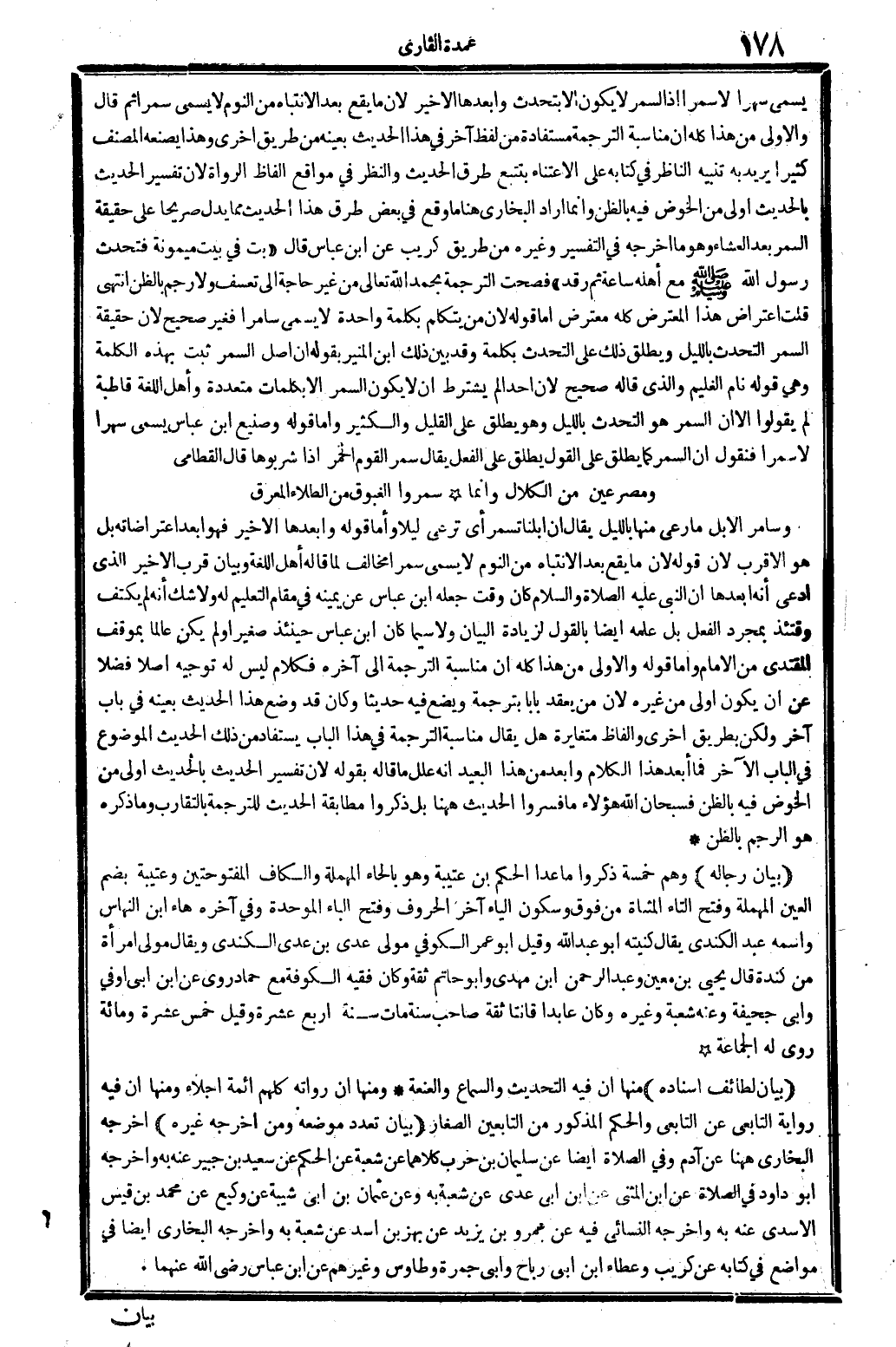 يُسمى سهرا لَا سمرا إِذْ السمر لَا يكون إِلَّا بتحدث وأبعدها الْأَخير لِأَن مَا يَقع بعد الانتباه من النّوم لَا يُسمى سمرا، ثمَّ قَالَ: وَالْأولَى من هَذَا كُله أَن مُنَاسبَة التَّرْجَمَة مستفادة من لفظ آخر فِي هَذَا الحَدِيث بِعَيْنِه من طَرِيق أُخْرَى، وَهَذَا يصنعه المُصَنّف كثيرا، يُرِيد بِهِ تَنْبِيه النَّاظر فِي كِتَابه على الاعتناء بتتبع طرق الحَدِيث، وَالنَّظَر فِي مواقع أَلْفَاظ الروَاة، لِأَن تَفْسِير الحَدِيث بِالْحَدِيثِ أولى من الْخَوْض فِيهِ بِالظَّنِّ، وَإِنَّمَا أَرَادَ البُخَارِيّ هُنَا مَا وَقع فِي بعض طرق هَذَا الحَدِيث مِمَّا يدل صَرِيحًا على حَقِيقَة السمر بعد الْعشَاء وَهُوَ مَا أخرجه فِي التَّفْسِير وَغَيره من طَرِيق كريب عَن ابْن عَبَّاس قَالَ: (بت فِي بَيت مَيْمُونَة، فَتحدث رَسُول الله صلى الله عَلَيْهِ وَسلم مَعَ أَهله سَاعَة ثمَّ رقد) فَصحت التَّرْجَمَة بِحَمْد الله تَعَالَى من غير حَاجَة إِلَى تعسف وَلَا رجم بِالظَّنِّ انْتهى. قلت: اعْتِرَاض هَذَا الْمُعْتَرض كُله معترض، أما قَوْله: لِأَن من يتَكَلَّم بِكَلِمَة وَاحِدَة لَا يُسمى سامرا، فَغير صَحِيح، لِأَن حَقِيقَة السمر التحدث بِاللَّيْلِ، وَيُطلق ذَلِك على التحدث بِكَلِمَة، وَقد بَين ذَلِك ابْن الْمُنِير بقوله: إِن أصل السمر ثَبت بِهَذِهِ الْكَلِمَة وَهِي قَوْله: (نَام الغليم) . وَالَّذِي قَالَه صَحِيح، لِأَن أحدا لم يشْتَرط أَن لَا يكون السمر إلاَّ بِكَلِمَات مُتعَدِّدَة، وَأهل اللُّغَة قاطبة لم يَقُولُوا إلاَّ أَن السمر هُوَ التحدث بِاللَّيْلِ، وَهُوَ يُطلق على الْقَلِيل وَالْكثير. وَأما قَوْله: وصنيع ابْن عَبَّاس يُسمى سهرا لَا سمرا، فَنَقُول: إِن السمر كَمَا يُطلق على القَوْل يُطلق على الْفِعْل يُقَال: سمر الْقَوْم الْخمر إِذا شَرِبُوهَا. قَالَ الْقطَامِي: