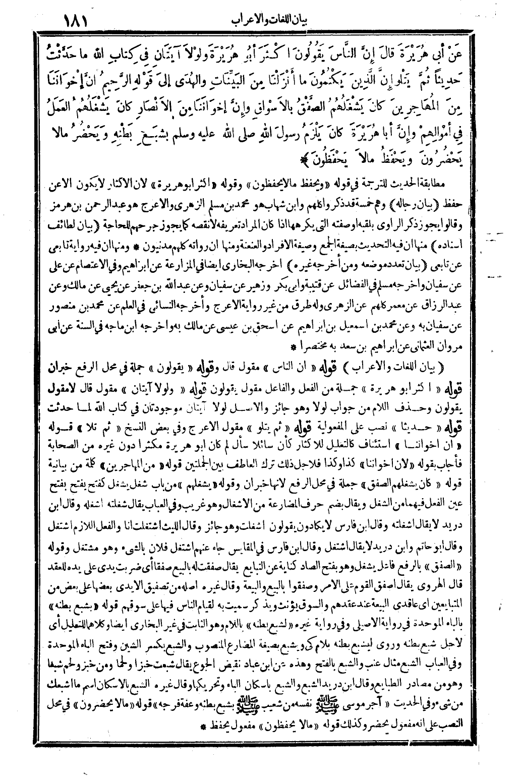 بَيَان اللُّغَات وَالْإِعْرَاب: قَوْله: (إِن النَّاس) مقول: قَالَ. وَقَوله: (يَقُولُونَ) جملَة فِي مَحل الرّفْع خبر: إِن، قَوْله: (أَكثر أَبُو هُرَيْرَة) جملَة من الْفِعْل وَالْفَاعِل مقول يَقُولُونَ. قَوْله: (وَلَوْلَا آيتان) مقول. قَالَ، لَا مقول: يَقُولُونَ. وَحذف اللَّام من جَوَاب لَوْلَا وَهُوَ جَائِز، وَالْأَصْل: لَوْلَا آيتان موجودتان فِي كتاب الله لما حدثت. قَوْله: (حَدِيثا) نصب على المفعولية. قَوْله: (ثمَّ يَتْلُو) مقول: الْأَعْرَج، وَفِي بعض النّسخ: (ثمَّ تَلا) . قَوْله: (إِن إِخْوَاننَا) اسْتِئْنَاف كالتعليل للإكثار، كأنّ سَائِلًا سَأَلَ: لم كَانَ أَبُو هُرَيْرَة مكثرا دون غَيره من الصَّحَابَة؟ فَأجَاب بقوله: (لِأَن إِخْوَاننَا) كَذَا وَكَذَا، فلأجل ذَلِك ترك العاطف بَين الجملتين. قَوْله: (من الْمُهَاجِرين) كلمة: من، بَيَانِيَّة. قَوْله: (كَانَ يشغلهم الصفق) جملَة فِي مَحل الرّفْع لِأَنَّهَا خبر: إِن. وَقَوله: (يشغلهم) من بَاب: شغل يشغل كفتح يفتح بِفَتْح، عين الْفِعْل فيهمَا من الشّغل، وَيُقَال بِضَم حرف المضارعة من الإشغال، وَهُوَ غَرِيب. وَفِي (الْعباب) يُقَال شغلته أشغله. وَقَالَ ابْن دُرَيْد: لَا يُقَال أشغلته. وَقَالَ ابْن فَارس: لَا يكادون يَقُولُونَ: أشغلت، وَهُوَ جَائِز. وَقَالَ اللَّيْث: اشتغلت أَنا، وَالْفِعْل اللَّازِم: اشْتغل. وَقَالَ أَبُو حَاتِم وَابْن دُرَيْد: لَا يُقَال: اشْتغل. وَقَالَ ابْن فَارس فِي (المقاييس) : جَاءَ عَنْهُم: اشْتغل فلَان بالشَّيْء وَهُوَ مشتغل. وَقَوله: (الصفق) بِالرَّفْع فَاعل: يشغل، وَهُوَ بِفَتْح الصَّاد كِنَايَة عَن التبايع. يُقَال: صفقت لَهُ بِالْبيعِ صفقا، أَي: ضربت يَدي على يَده للْعقد. قَالَ الْهَرَوِيّ: يُقَال: أصفق الْقَوْم على الْأَمر، وصفقوا بِالْبيعِ والبيعة. وَقَالَ غَيره: أَصله من تصفيق الْأَيْدِي بَعْضهَا على بعض من المتابعين، أَي: عاقدي الْبيعَة عِنْد عقدهم، والسوق يؤنث وَيذكر، سميت بِهِ لقِيَام النَّاس فِيهَا على سوقهم. قَوْله: (بشبع بَطْنه) بِالْبَاء الْمُوَحدَة فِي رِوَايَة الْأصيلِيّ، وَفِي رِوَايَة غَيره: (لشبع بَطْنه) بِاللَّامِ، وَهُوَ الثَّابِت فِي غير البُخَارِيّ أَيْضا، وَكِلَاهُمَا للتَّعْلِيل، أَي: لأجل شبع بَطْنه، وَرُوِيَ: ليشبع بَطْنه، بلام كي، ويشبع، يصيغة الْمُضَارع الْمَنْصُوب، والشبع، بِكَسْر الشين وَفتح الْبَاء الْمُوَحدَة. وَفِي (الْعباب) : الشِّبَع مِثَال عِنَب، والشبع بِالْفَتْح، وَهَذِه عَن ابْن عباد، نقيض الْجُوع. يُقَال: شبعت خبْزًا وَلَحْمًا، وَمن خبز وَلحم شبعاً، وَهُوَ من مصَادر الطبائع. وَقَالَ ابْن دُرَيْد: الشِّبَع والشبع بِإِسْكَان الْبَاء وتحريكها. وَقَالَ غَيره: الشِّبَع بالإسكان اسْم مَا أشبعك من شَيْء. وَفِي الحَدِيث: (آجر مُوسَى صلى الله عَلَيْهِ وَسلم نَفسه من شُعَيْب صلى الله عَلَيْهِ وَسلم بشبع بَطْنه وعفة فرجه) . قَوْله: (مَا لَا يحْضرُون) ، فِي مَحل النصب على أَنه مفعول: (يحضر) وَكَذَلِكَ قَوْله (مَا لَا يحفظون) مفعول (يحفظ) .