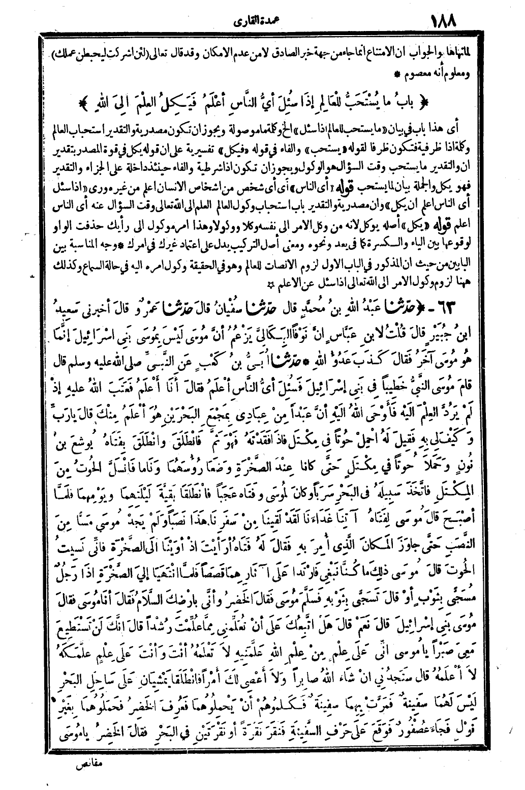 122 - حدّثنا عَبْدُ اللَّهِ بنُ مُحمَّدٍ قَالَ: حدّثنا سُفْيانُ قالَ: حدّثنا عَمْرٌ وقالَ: أَخْبرنِي سَعِيدُ بنُ جُبَيْرٍ قالَ: قُلتُ لابنِ عَبَّاسٍ: إنَّ نَوْفا البَكَالِيَّ يَزْعُمُ أنَّ مُوسَى لَيْسَ بِمُوسَى بَنِي إسْرَائِيلَ، إنَّمَا هُو مُوسَى آخَرُ. فَقالَ: كَذَبَ عَدُوُّ اللَّهِ. حدّثنا أُبَيُّ بنُ كَعْبٍ عَنِ النَّبيِّ صلى الله عَلَيْهِ وَسلم قَالَ: (قامَ مُوسَى النَّبيُّ خَطِيبا فِي بَنِي إسْرَائِيلَ. فَسُئِلَ: أيُّ النَّاسِ أعْلَمُ؟ فقالَ: أَنَا أَعْلَمُ، فَعَتَبَ اللَّهُ عليهِ إذْ لَمْ يَرُدَّ العِلْمَ إلَيْهِ، فَأَوْحَى اللَّهُ إلَيْهِ أنَّ عَبْدا مِنْ عِبَادِي بِمَجْمَعِ البَحْرَيْنِ هُوَ أعْلَمُ مِنْكَ، قالَ: يَا رَبِّ! وَكَيْفَ لي بهِ؟ فَقِيلَ لَهُ: احْمِلْ حُوتا فِي مِكْتَل فإذَا فَقَدْتَهُ فَهُوَ ثَمَّ، فانْطَلَقَ وانْطَلَقَ بِفَتَاهُ يُوشعَ بنُ نُونٍ وَحَمَلاَ حوتا فِي مِكْتَلٍ حَتَّى كَانَا عِنْدَ الصَّخْرَةِ وَضَعَا رُؤُوسَهُمَا وَنَاما، فَانْسَلَّ الحُوتُ مِنَ المِكْتَلِ فاتَّخَذَ سَبِيلَهُ فِي البَحْرِ سَرَبا، وكانَ لمُوسَى وفَتَاه عَجَبا، فانْطَلَقَا بَقِيَّةَ لَيْلَتِهِمَا ويَوْمِهَما فلَمَّا أصْبَحَ قَالَ مُوسَى لِفَتَاهُ: آتِنَا غَدَاءَنَا لَقَدْ لَقِينَا مِنْ سَفَرنَا هَذَا نَصَبا، وَلَمْ يَجدْ مُوسَى مَسًّا مِنَ النَّصَبِ حَتَّى جاوَزَ المَكانَ الَّذِي أُمِرَ بهِ، فَقالَ لَهُ فَتَاهُ: {أرَأيْتَ إذْ أوَيْنَا إلَى الصَّخْرَةِ فإنِّي نَسِيتُ الحُوتَ} (الْكَهْف: 63) قالَ مُوسَى: {ذلِكَ مَا كُنَّا نَبْغِي، فَارْتَدا عَلَى آثَارِهِمَا قَصَصا} (الْكَهْف: 64) فلمَّا انْتَهَيَا إِلَى الصَّخْرَةِ إذَا رَجُلٌ مُسَجَّى بِثَوْبٍ أوْ قالَ: تَسَجَّى بِثَوْبهِ فَسَلَّمِ مُوسَى فَقالَ الخَضِرُ: وأنَّى بأرْضِكَ السَّلامُ؟ فَقالَ: أنَا مُوسَى. فقالَ: مُوسَى بَنِي إسْرَائِيلَ؟ قالَ: نَعَمْ. قالَ: {هَلْ اتَّبِعُكَ عَلَى أنْ تُعَلِّمنِي مِمَّا عُلِّمْتَ رُشْدا. قالَ: إنَّكَ لَنْ تَسْتَطِيعَ مَعِي صَبْرا} (الْكَهْف: 66 67) يَا مُوسى إنِّي عَلَى عِلْمٍ مِنْ عِلْمِ اللَّه عَلَّمَنِيهِ لَا تَعْلَمُهُ أنْتَ، وأنْتَ عَلَى عِلْمٍ علّمَكَهُ لاَ أعْلَمُهُ، قَالَ: {سَتَجدُنِي إنْ شَاء اللَّهُ صابِرا وَلاَ أَعْصِي لَكَ أمْرا} (الْكَهْف: 69) فانْطَلَقَا يَمْشِيَانِ عَلَى سَاحِل البَحْرِ لَيْسَ لَهُمَا سَفِينةٌ، فَمَرَّتْ بِهِمَا سفِينَةٌ فَكَلمُوهُمْ أنْ يَحْمِلُوهُمَا، فَعُرِفَ الخَضِرُ فَحَمَلُوهُمَا بِغَيْرِ نَوْلِ، فَجَاءَ عُصْفُورٌ فَوقَعَ عَلَى حَرْفِ السَّفِينَةِ، فَنَقَرَ نَقْرَةً أَو نَقْرَتَيْنِ فِي البَحْرِ، فقالَ الخَضِرُ: يَا مُوسَى