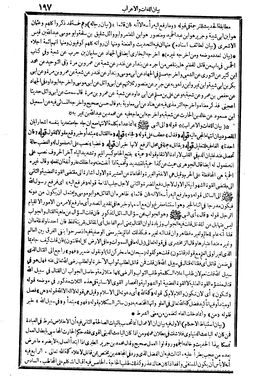بَيَان اللُّغَات وَالْإِعْرَاب: قَوْله: (إِلَى النَّبِي صلى الله عَلَيْهِ وَسلم) إِنَّمَا عداهُ بِكَلِمَة الِانْتِهَاء مَعَ أَن: جَاءَ، جَاءَ مُتَعَدِّيا بِنَفسِهِ إشعارا بِأَن الْمَقْصُود بَيَان انْتِهَاء الْمَجِيء إِلَيْهِ. قَوْله: (فَقَالَ) عطف على قَوْله: (فجَاء) . قَوْله: (مَا الْقِتَال؟) مُبْتَدأ وَخبر وَقع مقولاً لِلْقَوْلِ. قَوْله: (فَإِن أَحَدنَا) الْفَاء فِيهِ للتَّعْلِيل. قَوْله: (يُقَاتل) ، جملَة فِي مَحل الرّفْع لِأَنَّهَا خبر: إِن. قَوْله: (غَضبا) نصب على أَنه مفعول لَهُ، وَالْغَضَب حَالَة تحصل عِنْد غليان الدَّم فِي الْقلب لإِرَادَة الانتقام. قَوْله: (حمية) ، بِفَتْح الْحَاء وَكسر الْمِيم وَتَشْديد الْيَاء آخر الْحُرُوف: نصب على أَنه مفعول لَهُ أَيْضا. قَالَ الْجَوْهَرِي: حميت عَن كَذَا حمية، بِالتَّشْدِيدِ، وتحمية إِذا أنفت مِنْهُ وداخلك عَار وأنفة أَن تَفْعَلهُ. وَقَالَ غَيره: الحمية هِيَ الْمُحَافظَة على الْحرم. وَقيل: هِيَ الأنفة والغيرة والمحاماة عَن الْعَشِيرَة، وَالْأول: إِشَارَة إِلَى مُقْتَضى الْقُوَّة الغضبية، وَالثَّانِي: إِلَى مُقْتَضى الْقُوَّة الشهوانية. أَو الأول: لأجل دفع الْمضرَّة، وَالثَّانِي: لأجل جلب الْمَنْفَعَة. قَوْله: (فَرفع إِلَيْهِ) أَي: فَرفع رَسُول الله صلى الله عَلَيْهِ وَسلم إِلَى السَّائِل. قَوْله: (وَمَا رفع إِلَيْهِ رَأسه إِلَّا أَنه كَانَ قَائِما) ، ظَاهره أَن الْقَائِل هُوَ أَبُو مُوسَى، وَيحْتَمل أَن يكون من دونه فَيكون مدرجا فِي أثْنَاء الْخَبَر، وَهُوَ اسْتثِْنَاء مفرغ وَأَن مَعَ اسْمهَا وخبرها فِي تَقْدِير الْمصدر أَي: مَا رفع لأمر من الْأُمُور إِلَّا لقِيَام الرجل. قَوْله: (قَالَ) أَي النَّبِي صلى الله عَلَيْهِ وَسلم، وَهُوَ الْجَواب عَن سُؤال السَّائِل الْمَذْكُور. فَإِن قلت: السُّؤَال عَن مَاهِيَّة الْقِتَال، وَالْجَوَاب لَيْسَ عَنْهَا بل عَن الْمقَاتل. قلت: فِيهِ الْجَواب وَزِيَادَة، أَو أَن الْقِتَال بِمَعْنى اسْم الْفَاعِل أَي: الْمقَاتل، بِقَرِينَة لفظ: فَإِن أَحَدنَا. وَلَفْظَة: مَا إِن قُلْنَا: إِنَّه عَام للْعَالم وَلغيره فَظَاهر، وَإِن قُلْنَا إِنَّه لغيره فَكَذَلِك إِذا لم يعْتَبر معنى الوصفية فِيهِ إِذْ صَرَّحُوا بِنَفْي الْفرق بَين الْعَالم وَغَيره عِنْد اعْتِبَارهَا. وَقَالَ الزَّمَخْشَرِيّ، فِي قَوْله تَعَالَى: {بل لَهُ مَا فِي السَّمَوَات وَمَا فِي الأَرْض كل لَهُ قانتون} (الْبَقَرَة: 116) فَإِن قلت: كَيفَ جَاءَ بِمَا الَّذِي لغير أولي الْعلم مَعَ قَوْله: {قانتون} ؟ قلت: هُوَ كَقَوْلِه: سُبْحَانَ مَا سخركن لنا، أَو نقُول: ضمير (فَهُوَ) رَاجع إِلَى الْقِتَال الَّذِي فِي ضمن قَاتل، أَي: فقتاله قتال فِي سَبِيل الله. فَإِن قلت: فَمن قَاتل لطلب ثَوَاب الْآخِرَة أَو لطلب رضى الله تَعَالَى عَنهُ فَهَل هُوَ فِي سَبِيل الله؟ قلت: نعم لِأَن طلب إعلاء الْكَلِمَة، وَطلب الثَّوَاب والرضى كلهَا متلازمة، وَحَاصِل الْجَواب أَن الْقِتَال فِي سَبِيل الله قتال منشؤه الْقُوَّة الْعَقْلِيَّة لَا الْقُوَّة الغضبية أَو الشهوانية، وانحصار القوى الإنسانية فِي هَذِه الثَّلَاث مَذْكُور فِي مَوْضِعه. قَوْله: (لتَكون) ، أَي: لِأَن تكون، وَاللَّام: لَام كي. قَوْله: (كلمة الله) أَي: دَعوته إِلَى الْإِسْلَام. وَقيل: هِيَ قَوْله: لَا إِلَه إِلَّا الله. قَوْله: (هِيَ) ، فصل، أَو مُبْتَدأ. وفيهَا تَأْكِيد فضل كلمة الله تَعَالَى فِي الْعُلُوّ، وَأَنَّهَا المختصة بِهِ دون سَائِر الْكَلَام. قَوْله: (فَهُوَ) مُبْتَدأ. و (فِي سَبِيل الله) خبر لقَوْله: (من) ، وَإِنَّمَا دخلت الْفَاء لتضمن من معنى الشَّرْط.