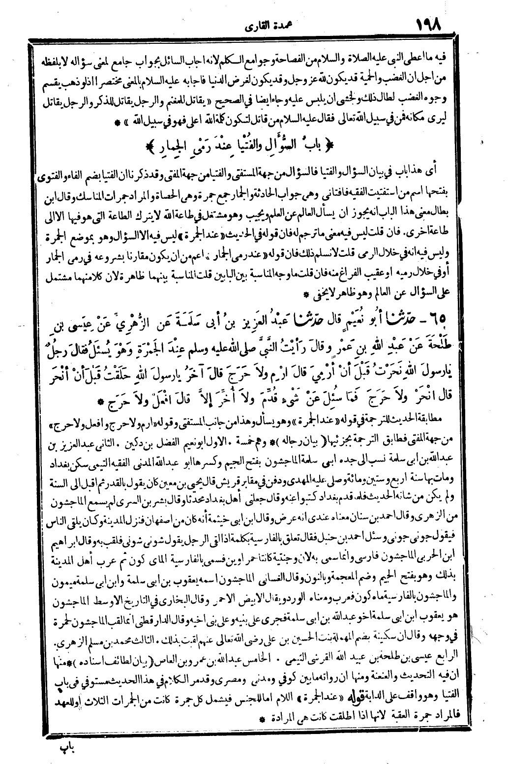 بَيَان رِجَاله: وهم خَمْسَة. الأول: أَبُو نعيم الْفضل بن دُكَيْن. الثَّانِي: عبد الْعَزِيز بن عبد الله بن أبي سَلمَة، نسب إِلَى جده أبي سَلمَة الْمَاجشون، بِفَتْح الْجِيم وَكسرهَا: أَبُو عبد الله الْمدنِي الْفَقِيه التَّيْمِيّ، سكن بَغْدَاد وَمَات بهَا سنة أَربع وَسِتِّينَ وَمِائَة، وَصلى عَلَيْهِ الْمهْدي وَدفن فِي مَقَابِر قُرَيْش. قَالَ يحيى بن معِين: كَانَ يَقُول بِالْقدرِ ثمَّ أقبل إِلَى السّنة وَلم يكن من شَأْنه الحَدِيث، فَلَمَّا قدم بَغْدَاد كتبُوا عَنهُ، وَقَالَ: جعلني أهل بَغْدَاد مُحدثا، وَقَالَ بشر بن السّري: لم يسمع الْمَاجشون من الزُّهْرِيّ، وَقَالَ أَحْمد بن سِنَان: مَعْنَاهُ عِنْدِي أَنه عرض. وَقَالَ ابْن أبي خَيْثَمَة: أَنه كَانَ من أصفهان فَنزل الْمَدِينَة، وَكَانَ يلقى النَّاس فَيَقُول: جَوْنِي جَوْنِي. وَسُئِلَ أَحْمد بن حَنْبَل، فَقَالَ: تعلق بِالْفَارِسِيَّةِ بِكَلِمَة إِذا لَقِي الرجل يَقُول: شوني شوني، فلقب بِهِ. وَقَالَ إِبْرَاهِيم الْحَرْبِيّ: الْمَاجشون فَارسي، وَإِنَّمَا سمي بِهِ لِأَن وجنتيه كَانَتَا حمراوين، فَسُمي بِالْفَارِسِيَّةِ: الماي كَون، ثمَّ عرب أهل الْمَدِينَة بذلك، وَهُوَ: بِفَتْح الْجِيم وَضم الْمُعْجَمَة وبالنون. وَقَالَ الغساني: الْمَاجشون اسْمه يَعْقُوب بن أبي سَلمَة، وَابْن أبي سَلمَة: مَيْمُون، والماجشون بِالْفَارِسِيَّةِ: ماه كَون، فعرب. وَمَعْنَاهُ الْورْد. وَيُقَال: الْأَبْيَض الْأَحْمَر. وَقَالَ البُخَارِيّ فِي (التَّارِيخ الْأَوْسَط) : الْمَاجشون هُوَ يَعْقُوب بن أبي سَلمَة أَخُو عبد الله بن أبي سَلمَة، فَجرى على بنيه وعَلى بني أَخِيه. وَقَالَ الدَّارَقُطْنِيّ: إِنَّمَا لقب الْمَاجشون لحمرة فِي وَجهه، وَقَالَ: إِن سكينَة، بِضَم الْمُهْملَة: بنت الْحُسَيْن بن عَليّ، رَضِي الله تَعَالَى عَنْهُم، لقبت بذلك. الثَّالِث: مُحَمَّد بن مُسلم الزُّهْرِيّ. الرَّابِع: عِيسَى بن طَلْحَة بن عبيد الله الْقرشِي التَّيْمِيّ. الْخَامِس: عبد الله بن عَمْرو بن الْعَاصِ.
