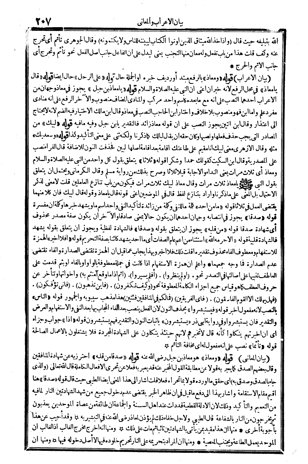 الله بتبليغه حَيْثُ قَالَ {وَإِذ أَخذ الله مِيثَاق الَّذين أُوتُوا الْكتاب ليبيننه للنَّاس وَلَا يكتمونه} وَقَالَ الْجَوْهَرِي تأثم أَي تحرج عَنهُ وكف قلت هَذَا من بَاب تفعل وَله معَان مِنْهَا التجنب يَعْنِي ليدل على أَن الْفَاعِل جَانب أصل الْفِعْل نَحْو تأثم وتحرج أَي جَانب الْإِثْم والحرج (بَيَان الْإِعْرَاب) قَوْله ومعاذ بِالرَّفْع مُبْتَدأ أَو رَدِيف خَبره أَو الْجُمْلَة حَال قَوْله على الرحل حَال أَيْضا قَوْله قَالَ يَا معَاذ فِي مَحل الرّفْع لِأَنَّهُ خبر إِن أَعنِي أَن النَّبِي صلى الله عَلَيْهِ وَسلم قَوْله يَا معَاذ بن جبل يجوز فِي معَاذ وَجْهَان من الْإِعْرَاب أَحدهمَا النصب على أَنه مَعَ مَا بعده كاسم وَاحِد مركب والمنادى الْمُضَاف مَنْصُوب وَالْآخر الرّفْع على أَنه منادى مُفْرد علم وَأما ابْن فَهُوَ مَنْصُوب بِلَا خلاف وَاخْتَارَ ابْن الْحَاجِب النصب فِي معَاذ وَقَالَ ابْن مَالك الِاخْتِيَار فِيهِ الضَّم لِأَنَّهُ لَا يحْتَاج إِلَى اعتذار وَقَالَ ابْن التِّين يجوز النصب على أَن قَوْله معَاذ زَائِد فالتقدير يَابْنَ جبل وَفِيه مَا فِيهِ قَوْله لبيْك من المصادر الَّتِي يجب حذف فعلهَا ونصبها وَكَانَ حَقه أَن يُقَال لبالك كَمَا ذكرنَا وَلكنه ثنى على معنى التَّأْكِيد وَكَذَا قَوْله وَسَعْديك مثله وَقَالَ الْأَزْهَرِي معنى لبيْك أَنا مُقيم على طَاعَتك إِقَامَة بعد إِقَامَة أَصْلهَا لبين فحذفت النُّون للإضافة قَالَ الْفراء نصب على المصدرية وَقَالَ ابْن السّكيت كَقَوْلِك حمدا وشكرا قَوْله ثَلَاثًا يتَعَلَّق بقول كل وَاحِد من النَّبِي صلى الله عَلَيْهِ وَسلم ومعاذ أَي ثَلَاث مَرَّات يَعْنِي النداء والإجابة قيلا ثَلَاثًا وَصرح بذلك من رِوَايَة مُسلم وَقَالَ الْكرْمَانِي وَيحْتَمل أَن يتَعَلَّق بقول النَّبِي صلى الله عَلَيْهِ وَسلم يَا معَاذ ثَلَاث مَرَّات وَقَالَ معَاذ لبيْك ثَلَاث مَرَّات فَيكون من بَاب تنَازع العاملين قلت لَا معنى لذكر الِاحْتِمَال بل الْمَعْنى على مَا ذكرنَا وَأَرَادَ بتنازع لفظ قَالَ فِي الْمَوْضِعَيْنِ أَعنِي قَوْله قَالَ يَا معَاذ وَقَوله قَالَ لبيْك فَإِن كلا مِنْهُمَا يَقْتَضِي الْعَمَل فِي ثَلَاثًا قَوْله مَا من أحد كلمة مَا للنَّفْي وَكلمَة من زَائِدَة لتأكيد النَّفْي وَاحِد اسْم مَا وَيشْهد خَبَرهَا وَكلمَة أَن مفسرة قَوْله صدقا يجوز فِي انتصابه وَجْهَان أَحدهمَا أَن يكون حَالا بِمَعْنى صَادِقا وَالْآخر أَن يكون صفة مصدر مَحْذُوف أَي شَهَادَة صدقا قَوْله من قلبه يجوز أَن يتَعَلَّق بقوله صدقا فالشهادة لفظية وَيجوز أَن يتَعَلَّق بقوله يشْهد فالشهادة قلبية قَوْله إِلَّا حرمه الله اسْتثِْنَاء من أَعم عَام الصِّفَات أَي مَا أحد يشْهد كَائِنا بِصفة التَّحْرِيم قَوْله أَفلا أخبر الْهمزَة للاستفهام ومعطوف الْفَاء مَحْذُوف تَقْدِيره أقلت ذَلِك فَلَا أخبر وَبِهَذَا يُجَاب عَمَّا قيل أَن الْهمزَة تَقْتَضِي الصدارة وَالْفَاء تَقْتَضِي عدم الصدارة فَمَا وَجه جَمعهمَا وَاعْلَم أَن همزَة الِاسْتِفْهَام إِذا كَانَت فِي جملَة معطوفة بِالْوَاو أَو بِالْفَاءِ أَو بثم قدمت على العاطف تَنْبِيها على أصالتها فِي التصدر نَحْو {أولم ينْظرُوا} {أفلم يَسِيرُوا} {أَثم إِذا مَا وَقع آمنتم بِهِ} وَأَخَوَاتهَا وتتأخر عَن حُرُوف الْعَطف كَمَا هُوَ قِيَاس جَمِيع أَجزَاء الْكَلِمَة المعطوفة نَحْو {وَكَيف تكفرون} {فَأَيْنَ تذهبون} {فَأنى تؤفكون} {فَهَل يهْلك إِلَّا الْقَوْم الْفَاسِقُونَ} {فَأَي الْفَرِيقَيْنِ} {فَمَا لكم فِي الْمُنَافِقين فئتين} هَذَا مَذْهَب سِيبَوَيْهٍ وَالْجُمْهُور قَوْله النَّاس بِالنّصب لِأَنَّهُ مفعول أخبر قَوْله فيستبشروا بِحَذْف النُّون لِأَن الْفِعْل ينصب بعد الْفَاء المجاب بهَا بعد النَّفْي والاستفهام وَالْعرض وَالتَّقْدِير فَإِن يستبشروا وَفِي رِوَايَة أبي ذَر يستبشرون 