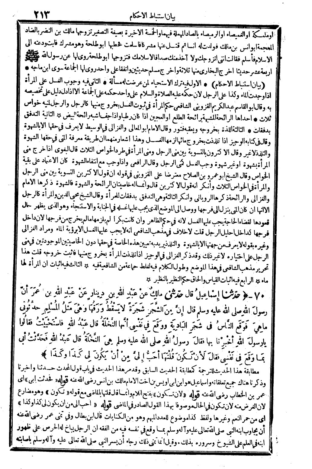 70 - (حَدثنَا إِسْمَاعِيل قَالَ حَدثنِي مَالك عَن عبد الله بن دِينَار عَن عبد الله بن عمر أَن رَسُول الله صلى الله عَلَيْهِ وَسلم قَالَ إِن من الشّجر شَجَرَة لَا يسْقط وَرقهَا وَهِي مثل الْمُسلم حَدثُونِي مَا هِيَ فَوَقع النَّاس فِي شجر الْبَادِيَة وَوَقع فِي نَفسِي أَنَّهَا النَّخْلَة قَالَ عبد الله فَاسْتَحْيَيْت فَقَالُوا يَا رَسُول الله أخبرنَا بهَا فَقَالَ رَسُول الله صلى الله عَلَيْهِ وَسلم هِيَ النَّخْلَة قَالَ عبد الله فَحدثت أبي بِمَا وَقع فِي نَفسِي فَقَالَ لِأَن تكون قلتهَا أحب إِلَيّ من أَن يكون لي كَذَا وَكَذَا) مُطَابقَة هَذَا الحَدِيث للتَّرْجَمَة كمطابقة الحَدِيث السَّابِق وَقد مر هَذَا الحَدِيث فِي بَاب قَول الْمُحدث حَدثنَا وَأخْبرنَا وَذكرنَا هُنَاكَ جَمِيع تعلقاته وَإِسْمَاعِيل هُوَ ابْن أبي أويس بن أُخْت الإِمَام مَالك بن أنس رَضِي الله عَنهُ قَوْله فَحدثت أبي أَي عمر بن الْخطاب رَضِي الله عَنهُ قَوْله لِأَن تكون بِفَتْح اللَّام وَإِنَّمَا قَالَ قلتهَا بالماضي مَعَ قَوْله تكون وَهُوَ مضارع لِأَن الْغَرَض مِنْهُ لِأَن تكون فِي الْحَال مَوْصُوفا بِهَذَا القَوْل الصَّادِر فِي الْمَاضِي قَوْله أحب إِلَيّ من أَن يكون لي كَذَا وَكَذَا أَي من حمر النعم وَغَيرهَا وَلَفظ كَذَا مَوْضُوع للعدد الْمُبْهم وَهُوَ من الْكِنَايَات قَالَ ابْن بطال وَفِي تمني عمر رَضِي الله عَنهُ أَن يُجَاوب ابْنه النَّبِي صلى الله تَعَالَى عَلَيْهِ وَآله وَسلم بِمَا وَقع فِي نَفسه فِيهِ من الْفِقْه أَن الرجل يباخ لَهُ الْحِرْص على ظُهُور ابْنه فِي الْعلم على الشُّيُوخ وسروره بذلك. وَقيل إِنَّمَا تمنى ذَلِك رَجَاء أَن يسر النَّبِي صلى الله تَعَالَى عَلَيْهِ وَآله وَسلم بإصابته