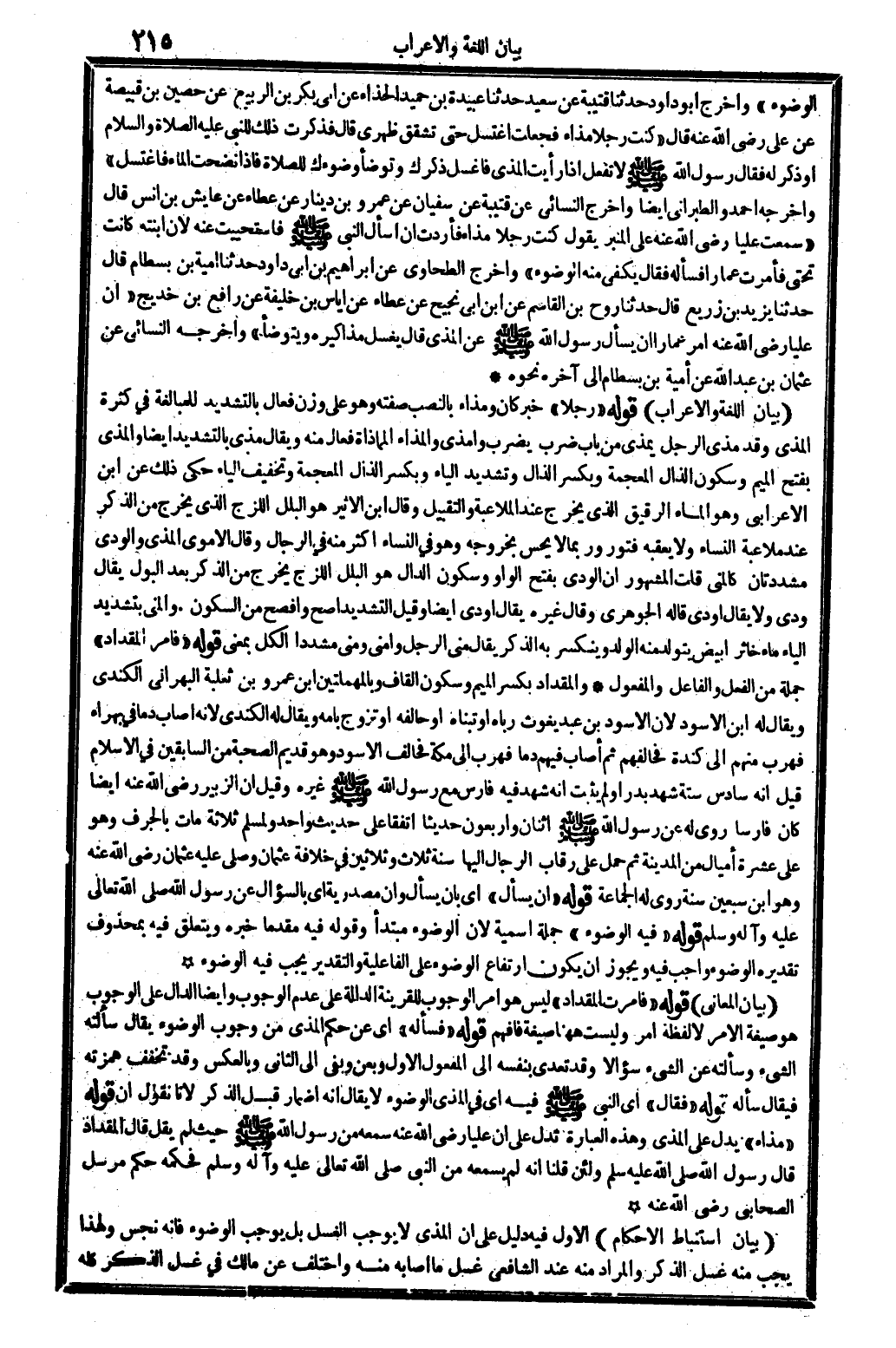 الْوضُوء وَأخرج أَبُو دَاوُد حَدثنَا قُتَيْبَة عَن سعيد حَدثنَا عُبَيْدَة بن حميد الْحذاء عَن أبي بكر بن الرّبيع عَن حُصَيْن بن قبيصَة عَن عَليّ رَضِي الله عَنهُ قَالَ كنت رجلا مذاء فَجعلت أَغْتَسِل حَتَّى تشقق ظَهْري قَالَ فَذكرت ذَلِك للنَّبِي عَلَيْهِ الصَّلَاة وَالسَّلَام أَو ذكر لَهُ فَقَالَ رَسُول الله صلى الله عَلَيْهِ وَسلم لَا تفعل إِذا رَأَيْت الْمَذْي فاغسل ذكرك وَتَوَضَّأ وضوءك للصَّلَاة فَإِذا نضحت المَاء فاغتسل وَأخرجه أَحْمد وَالطَّبَرَانِيّ أَيْضا وَأخرج النَّسَائِيّ عَن قُتَيْبَة عَن سُفْيَان عَن عَمْرو بن دِينَار عَن عَطاء عَن عايش بن أنس قَالَ سَمِعت عليا رَضِي الله عَنهُ على الْمِنْبَر يَقُول كنت رجلا مذاء فَأَرَدْت أَن أسأَل النَّبِي صلى الله عَلَيْهِ وَسلم فَاسْتَحْيَيْت عَنهُ لِأَن ابْنَته كَانَت تحتي فَأمرت عمارا فَسَأَلَهُ فَقَالَ يَكْفِي مِنْهُ الْوضُوء وَأخرج الطَّحَاوِيّ عَن إِبْرَاهِيم بن أبي دَاوُد حَدثنَا أُميَّة بن بسطَام قَالَ حَدثنَا يزِيد بن زُرَيْع قَالَ حَدثنَا روح بن الْقَاسِم عَن ابْن أبي نجيح عَن عَطاء عَن إِيَاس بن خَليفَة عَن رَافع بن خديج أَن عليا رَضِي الله عَنهُ أَمر عمارا أَن يسْأَل رَسُول الله صلى الله عَلَيْهِ وَسلم عَن الْمَذْي قَالَ يغسل مذاكيره وَيتَوَضَّأ وَأخرجه النَّسَائِيّ عَن عُثْمَان بن عبد الله عَن أُميَّة بن بسطَام إِلَى آخِره نَحوه (بَيَان اللُّغَة وَالْإِعْرَاب) قَوْله رجلا خبر كَانَ ومذاء بِالنّصب صفته وَهُوَ على وزن فعال بِالتَّشْدِيدِ للْمُبَالَغَة فِي كَثْرَة الْمَذْي وَقد مذى الرجل يمذي من بَاب ضرب يضْرب وأمذى والمذاء المماذاة فعال مِنْهُ وَيُقَال مذى بِالتَّشْدِيدِ أَيْضا والمذي بِفَتْح الْمِيم وَسُكُون الذَّال الْمُعْجَمَة وبكسر الذَّال وَتَشْديد الْيَاء وبكسر الذَّال الْمُعْجَمَة وَتَخْفِيف الْيَاء حكى ذَلِك عَن ابْن الْأَعرَابِي وَهُوَ المَاء الرَّقِيق الَّذِي يخرج عِنْد الملاعبة والتقبيل وَقَالَ ابْن الْأَثِير هُوَ البلل اللزج الَّذِي يخرج من الذّكر عِنْد ملاعبة النِّسَاء وَلَا يعقبه فتور وَرُبمَا لَا يحس بِخُرُوجِهِ وَهُوَ فِي النِّسَاء أَكثر مِنْهُ فِي الرِّجَال وَقَالَ الْأمَوِي الْمَذْي والودي مشددتان كالمني قلت الْمَشْهُور أَن الودي بِفَتْح الْوَاو وَسُكُون الدَّال هُوَ البلل اللزج يخرج من الذّكر بعد الْبَوْل يُقَال ودي وَلَا يُقَال أودي قَالَه الْجَوْهَرِي وَقَالَ غَيره يُقَال أودي أَيْضا وَقيل التَّشْدِيد أصح وأفصح من السّكُون. والمني بتَشْديد الْيَاء مَاء خاثر أَبيض يتَوَلَّد مِنْهُ الْوَلَد وينكسر بِهِ الذّكر يُقَال مني الرجل وأمنى ومني مشددا الْكل بِمَعْنى قَوْله فَأمر الْمِقْدَاد جملَة من الْفِعْل وَالْفَاعِل وَالْمَفْعُول والمقداد بِكَسْر الْمِيم وَسُكُون الْقَاف وبالمهملتين ابْن عَمْرو بن ثَعْلَبَة البهراني الْكِنْدِيّ وَيُقَال لَهُ ابْن الْأسود لِأَن الْأسود بن عبد يَغُوث رباه أَو تبناه أَو حالفه أَو تزوج بِأُمِّهِ وَيُقَال لَهُ الْكِنْدِيّ لِأَنَّهُ أصَاب دَمًا فِي بهراء فهرب مِنْهُم إِلَى كِنْدَة فحالفهم ثمَّ أصَاب فيهم دَمًا فهرب إِلَى مَكَّة فحالف الْأسود وَهُوَ قديم الصُّحْبَة من السَّابِقين فِي الْإِسْلَام قيل أَنه سادس سِتَّة شهد بَدْرًا وَلم يثبت أَنه شهد فِيهِ فَارس مَعَ رَسُول الله صلى الله عَلَيْهِ وَسلم غَيره وَقيل أَن الزبير رَضِي الله عَنهُ أَيْضا كَانَ فَارِسًا روى لَهُ عَن رَسُول الله صلى الله عَلَيْهِ وَسلم اثْنَان وَأَرْبَعُونَ حَدِيثا اتفقَا على حَدِيث وَاحِد وَلمُسلم ثَلَاثَة مَاتَ بالجرف وَهُوَ على عشرَة أَمْيَال من الْمَدِينَة ثمَّ حمل على رِقَاب الرِّجَال إِلَيْهَا سنة ثَلَاث وَثَلَاثِينَ فِي خلَافَة عُثْمَان وَصلى عَلَيْهِ عُثْمَان رَضِي الله عَنهُ وَهُوَ ابْن سبعين سنة روى لَهُ