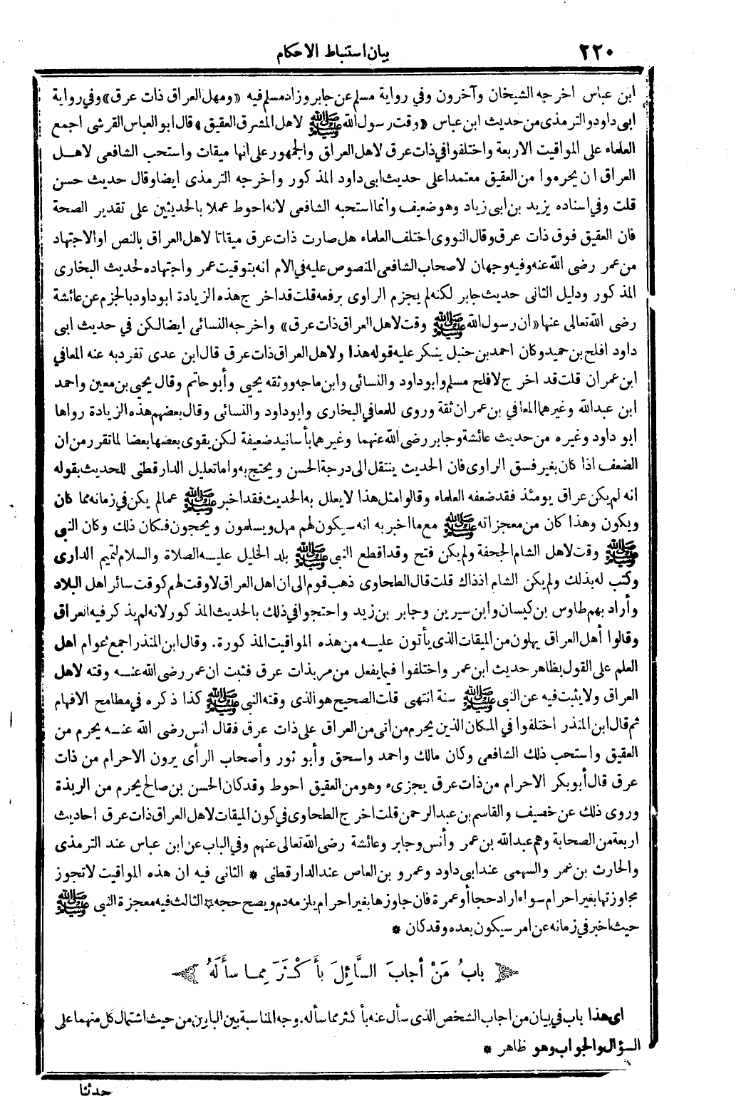 ابْن عَبَّاس أخرجه الشَّيْخَانِ وَآخَرُونَ وَفِي رِوَايَة مُسلم عَن جَابر وَزَاد مُسلم فِيهِ ومهل الْعرَاق ذَات عرق وَفِي رِوَايَة أبي دَاوُد وَالتِّرْمِذِيّ من حَدِيث ابْن عَبَّاس وَقت رَسُول الله صلى الله عَلَيْهِ وَسلم لأهل الْمشرق العقيق قَالَ أَبُو الْعَبَّاس الْقرشِي أجمع الْعلمَاء على الْمَوَاقِيت الْأَرْبَعَة وَاخْتلفُوا فِي ذَات عرق لأهل الْعرَاق وَالْجُمْهُور على أَنَّهَا مِيقَات وَاسْتحبَّ الشَّافِعِي لأهل الْعرَاق أَن يحرموا من العقيق مُعْتَمدًا على حَدِيث أبي دَاوُد الْمَذْكُور وَأخرجه التِّرْمِذِيّ أَيْضا وَقَالَ حَدِيث حسن قلت وَفِي إِسْنَاده يزِيد بن أبي زِيَاد وَهُوَ ضَعِيف وَإِنَّمَا استحبه الشَّافِعِي لِأَنَّهُ أحوط عملا بِالْحَدِيثين على تَقْدِير الصِّحَّة فَإِن العقيق فَوق ذَات عرق وَقَالَ النَّوَوِيّ اخْتلف الْعلمَاء هَل صَارَت ذَات عرق ميقاتا لأهل الْعرَاق بِالنَّصِّ أَو الِاجْتِهَاد من عمر رَضِي الله عَنهُ وَفِيه وَجْهَان لأَصْحَاب الشَّافِعِي الْمَنْصُوص عَلَيْهِ فِي الْأُم أَنه بتوقيت عمر واجتهاده لحَدِيث البُخَارِيّ الْمَذْكُور وَدَلِيل الثَّانِي حَدِيث جَابر لكنه لم يجْزم الرَّاوِي بِرَفْعِهِ قلت قد أخرج هَذِه الزِّيَادَة أَبُو دَاوُد بِالْجَزْمِ عَن عَائِشَة رَضِي الله تَعَالَى عَنْهَا أَن رَسُول الله صلى الله عَلَيْهِ وَسلم وَقت لأهل الْعرَاق ذَات عرق وَأخرجه النَّسَائِيّ أَيْضا لَكِن فِي حَدِيث أبي دَاوُد أَفْلح بن حميد وَكَانَ أَحْمد بن حَنْبَل يُنكر عَلَيْهِ قَوْله هَذَا وَلأَهل الْعرَاق ذَات عرق قَالَ ابْن عدي تفرد بِهِ عَنهُ الْمعَافي ابْن عمرَان قلت قد أخرج لأفلح مُسلم وَأَبُو دَاوُد وَالنَّسَائِيّ وَابْن مَاجَه وَوَثَّقَهُ يحيى وَأَبُو حَاتِم وَقَالَ يحيى بن معِين وَأحمد بن عبد الله وَغَيرهمَا الْمعَافي بن عمرَان ثِقَة وروى للمعافي البُخَارِيّ وَأَبُو دَاوُد وَالنَّسَائِيّ وَقَالَ بَعضهم هَذِه الزِّيَادَة رَوَاهَا أَبُو دَاوُد وَغَيره من حَدِيث عَائِشَة وَجَابِر رَضِي الله عَنْهُمَا وَغَيرهمَا بأسانيد ضَعِيفَة لَكِن يُقَوي بَعْضهَا بَعْضًا لما تقرر من أَن الضعْف إِذا كَانَ بِغَيْر فسق الرَّاوِي فَإِن الحَدِيث ينْتَقل إِلَى دَرَجَة الْحسن ويحتج بِهِ وَأما تَعْلِيل الدَّارَقُطْنِيّ للْحَدِيث بقوله إِنَّه لم يكن عراق يَوْمئِذٍ فقد ضعفه الْعلمَاء وَقَالُوا مثل هَذَا لَا يُعلل بِهِ الحَدِيث فقد أخبر صلى الله عَلَيْهِ وَسلم عَمَّا لم يكن فِي زَمَانه مِمَّا كَانَ وَيكون وَهَذَا كَانَ من معجزاته صلى الله عَلَيْهِ وَسلم مَعَ مَا أخبر بِهِ أَنه سَيكون لَهُم مهل ويسلمون ويحجون فَكَانَ ذَلِك وَكَانَ النَّبِي صلى الله عَلَيْهِ وَسلم وَقت لأهل الشَّام الْجحْفَة وَلم يكن فتح وَقد أقطع النَّبِي صلى الله عَلَيْهِ وَسلم بلد الْخَلِيل عَلَيْهِ الصَّلَاة وَالسَّلَام لتميم الدَّارِيّ وَكتب لَهُ بذلك وَلم يكن الشَّام إِذْ ذَاك قلت قَالَ الطَّحَاوِيّ ذهب قوم إِلَى أَن أهل الْعرَاق لَا وَقت لَهُم كوقت سَائِر أهل الْبِلَاد وَأَرَادَ بهم طَاوس بن كيسَان وَابْن سِيرِين وَجَابِر بن زيد وَاحْتَجُّوا فِي ذَلِك بِالْحَدِيثِ الْمَذْكُور لِأَنَّهُ لم يذكر فِيهِ الْعرَاق وَقَالُوا أهل الْعرَاق يهلون من الْمِيقَات الَّذِي يأْتونَ عَلَيْهِ من هَذِه الْمَوَاقِيت الْمَذْكُورَة. وَقَالَ ابْن الْمُنْذر أجمع عوام أهل الْعلم على القَوْل بِظَاهِر حَدِيث ابْن عمر وَاخْتلفُوا فِيمَا يفعل من مر بِذَات عرق فَثَبت أَن عمر رَضِي الله عَنهُ وقته لأهل الْعرَاق وَلَا يثبت فِيهِ عَن النَّبِي صلى الله عَلَيْهِ وَسلم سنة انْتهى قلت الصَّحِيح هُوَ الَّذِي وقته النَّبِي صلى الله عَلَيْهِ وَسلم كَذَا ذكره فِي مطامح الأفهام ثمَّ قَالَ ابْن الْمُنْذر اخْتلفُوا فِي الْمَكَان الَّذِي يحرم من أَتَى من الْع