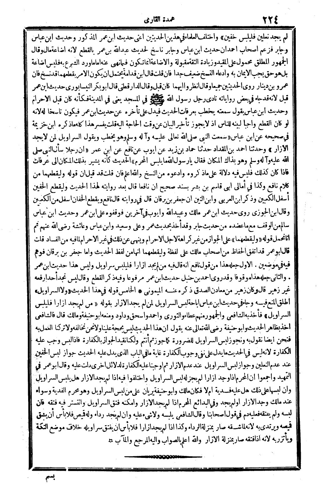 لم يجد نَعْلَيْنِ فليلبس خُفَّيْنِ وَاخْتلف الْعلمَاء فِي هذَيْن الْحَدِيثين أَعنِي حَدِيث ابْن عمر الْمَذْكُور وَحَدِيث ابْن عَبَّاس وَجَابِر فَزعم أَصْحَاب أَحْمد أَن حَدِيث ابْن عَبَّاس وَجَابِر نَاسخ لحَدِيث عبد الله بن عمر بِالْقطعِ لِأَنَّهُ إِضَاعَة مَال وَقَالَ الْجُمْهُور الْمُطلق مَحْمُول على الْمُقَيد وَزِيَادَة الثِّقَة مَقْبُولَة والإضاعة إِنَّمَا تكون فِيمَا نهى عَنهُ أما مَا ورد الشَّرْع بِهِ فَلَيْسَ إِضَاعَة بل هُوَ حق يجب الْإِيمَان بِهِ وادعاء النّسخ ضَعِيف جدا فَإِن قلت قَالَ ابْن قدامَة يحْتَمل أَن يكون الْأَمر بقطعهما قد نسخ فَإِن عَمْرو بن دِينَار روى الْحَدِيثين جَمِيعًا وَقَالَ انْظُرُوا أَيهمَا كَانَ قبل وَقَالَ الدَّارَقُطْنِيّ قَالَ أَبُو بكر النَّيْسَابُورِي حَدِيث ابْن عمر قبل لِأَنَّهُ قد جَاءَ فِي بعض رواياته نَادَى رجل رَسُول الله صلى الله عَلَيْهِ وَسلم فِي الْمَسْجِد يَعْنِي فِي الْمَدِينَة فَكَأَنَّهُ كَانَ قبل الْإِحْرَام وَحَدِيث ابْن عَبَّاس يَقُول سمعته يخْطب بِعَرَفَات الحَدِيث فَيدل على تَأَخره عَن حَدِيث ابْن عمر فَيكون نَاسِخا لَهُ لِأَنَّهُ لَو كَانَ الْقطع وَاجِبا لبينه للنَّاس إِذْ لَا يجوز تَأْخِير الْبَيَان عَن وَقت الْحَاجة إِلَيْهِ قلت يُفَسر هَذَا كُله مَا ذكره ابْن خُزَيْمَة فِي صَحِيحه عَن ابْن عَبَّاس سَمِعت النَّبِي صلى الله تَعَالَى عَلَيْهِ وَآله وَسلم وَهُوَ يخْطب وَيَقُول السَّرَاوِيل لمن لَا يجد الْإِزَار وَحدثنَا أَحْمد بن الْمِقْدَاد حَدثنَا حَمَّاد بن زيد عَن أَيُّوب عَن نَافِع عَن ابْن عمر أَن رجلا سَأَلَ النَّبِي صلى الله عَلَيْهِ وَسلم وَهُوَ بِذَاكَ الْمَكَان فَقَالَ يَا رَسُول الله مَا يلبس الْمحرم الحَدِيث كَأَنَّهُ يُشِير بذلك الْمَكَان إِلَى عَرَفَات فَإِذا كَانَ كَذَلِك فَلَيْسَ فِيهِ دلَالَة على مَا ذَكرُوهُ وادعوه من النّسخ وَالله أعلم فَإِن قلت قد قيل أَن قَوْله وليقطعهما من كَلَام نَافِع وَكَذَا فِي أمالي أبي قَاسم بن بشر بِسَنَد صَحِيح أَن نَافِعًا قَالَ بعد رِوَايَته لهَذَا الحَدِيث وليقطع الْخُفَّيْنِ أَسْفَل الْكَعْبَيْنِ وَذكر ابْن الْعَرَبِيّ وَابْن التِّين أَن جَعْفَر بن برْقَان قَالَ فِي رِوَايَته قَالَ نَافِع وَيقطع الخفان أَسْفَل من الْكَعْبَيْنِ وَقَالَ ابْن الْجَوْزِيّ روى حَدِيث ابْن عمر مَالك وَعبيد الله وَأَيوب فِي آخَرين فوقفوه على ابْن عمر وَحَدِيث ابْن عَبَّاس سَالم من الْوَقْف مَعَ مَا عضده من حَدِيث جَابر وَقد أَخذ بِحَدِيث عمر وَعلي وَسَعِيد وَابْن عَبَّاس وَعَائِشَة رَضِي الله عَنْهُم ثمَّ أَنا نحمل قَوْله وليقطعهما على الْجَوَاز من غير كَرَاهَة لأجل الْإِحْرَام وَينْهى عَن ذَلِك فِي غير الْإِحْرَام لما فِيهِ من الْفساد قلت قَالَ أَبُو عمر قد اتّفق الْحفاظ من أَصْحَاب مَالك على لَفْظَة وليقطعهما أَنَّهَا من لفظ الحَدِيث وَأما جَعْفَر بن برْقَان فَوَهم فِيهِ فِي موضِعين. الأول جعله هَذَا من قَول نَافِع أَنه قَالَ فِيهِ من لم يجد إزارا فليلبس سَرَاوِيل وَلَيْسَ هَذَا حَدِيث ابْن عمر. وَالثَّانِي جعله هَذَا مَوْقُوفا وَقد روى أَحْمد بن حَنْبَل حَدِيث ابْن عمر مَرْفُوعا وَفِيه ذكر الْقطع وَقَالَ لَيْسَ نجد أحدا رَفعه غير زُهَيْر قَالَ وَكَانَ زُهَيْر من معادن الصدْق ذكره عَنهُ الْمَيْمُونِيّ الْخَامِس قَوْله فِي هَذَا الحَدِيث وَلَا السَّرَاوِيل أطلق الْمَنْع فِيهِ وَجَاء فِي حَدِيث ابْن عَبَّاس إِبَاحَة لبس السَّرَاوِيل لمن لم يجد الْإِزَار بقوله من لم يجد إزارا فليلبس السَّرَاوِيل فَأخذ بِهِ الشَّافِعِي وَالْجُمْهُور مِنْهُم عَطاء وَالثَّوْري وَأحمد وَإِسْحَق وَدَاوُد وَمنعه أَبُو حنيفَة وَمَالك قَالَ فالشافعي أَخذ بِظَاهِر الحَدِيث وَأَبُو حنيفَة رَضِي الله تَعَالَى عَنهُ يَقُول إِن هَذَا ا