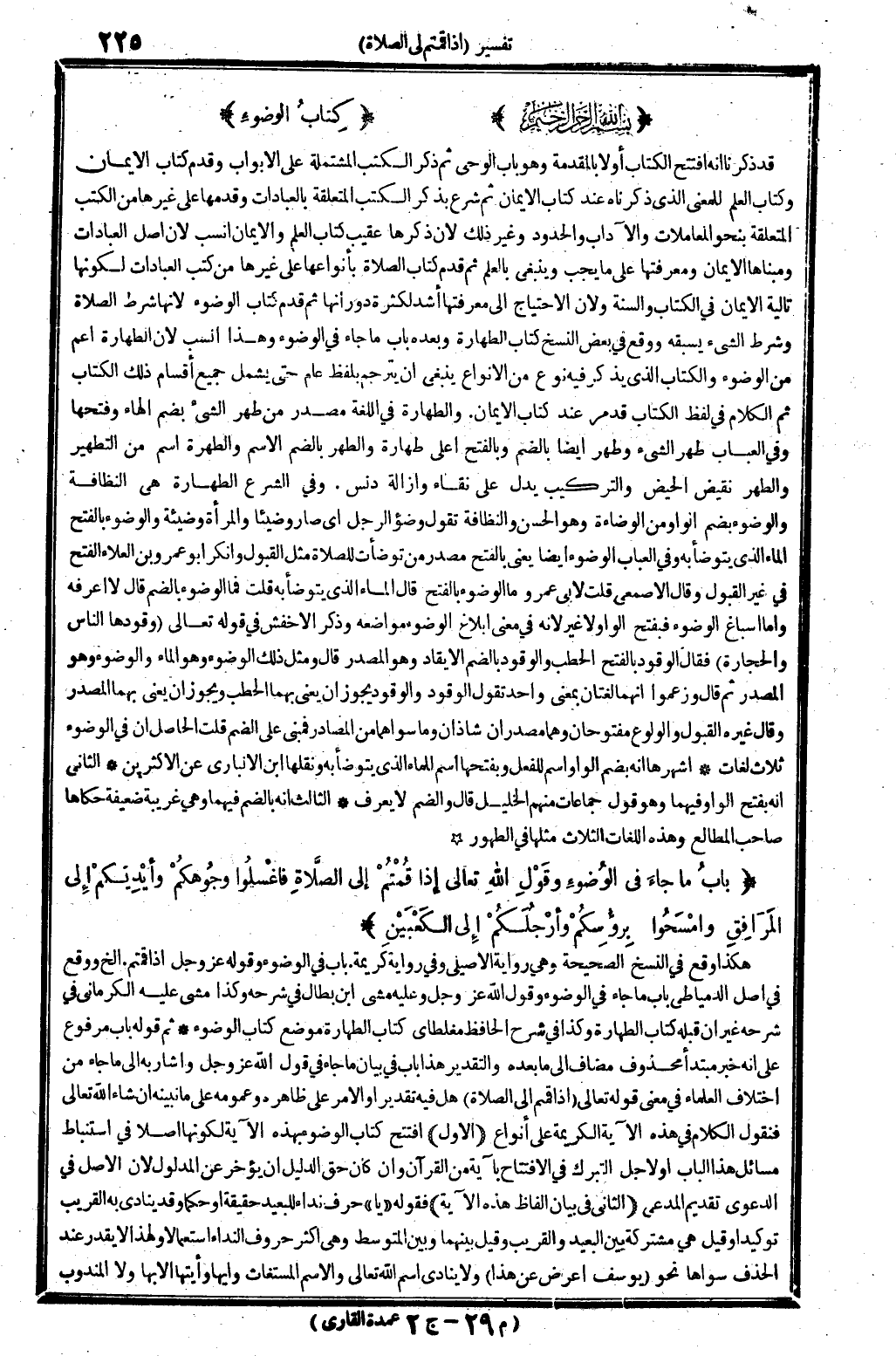 هَكَذَا وَقع فِي النّسخ الصَّحِيحَة وَهِي رِوَايَة الْأصيلِيّ وَفِي رِوَايَة كَرِيمَة. بَاب فِي الْوضُوء وَقَوله عز وَجل إِذا قُمْتُم. الخ وَوَقع فِي أصل الدمياطي بَاب مَا جَاءَ فِي الْوضُوء وَقَول الله عز وَجل وَعَلِيهِ مَشى ابْن بطال فِي شَرحه وَكَذَا مَشى عَلَيْهِ الْكرْمَانِي فِي شَرحه غير أَن قبله كتاب الطَّهَارَة وَكَذَا فِي شرح الْحَافِظ مغلطاي كتاب الطَّهَارَة مَوضِع كتاب الْوضُوء ثمَّ قَوْله بَاب مَرْفُوع على أَنه خبر مُبْتَدأ مَحْذُوف مُضَاف إِلَى مَا بعده وَالتَّقْدِير هَذَا بَاب فِي بَيَان ماجاء فِي قَول الله عز وَجل وَأَشَارَ بِهِ إِلَى مَا جَاءَ من اخْتِلَاف الْعلمَاء فِي معنى قَوْله تَعَالَى {إِذا قُمْتُم إِلَى الصَّلَاة} هَل فِيهِ تَقْدِير أَو الْأَمر على ظَاهره وعمومه على مَا نبينه إِن شَاءَ الله تَعَالَى فَنَقُول الْكَلَام فِي هَذِه الْآيَة الْكَرِيمَة على أَنْوَاع (الأول) افْتتح كتاب الْوضُوء بِهَذِهِ الْآيَة لكَونهَا أصلا فِي استنباط مسَائِل هَذَا الْبَاب أَو لأجل التَّبَرُّك فِي الِافْتِتَاح بِآيَة من الْقُرْآن وَإِن كَانَ حق الدَّلِيل أَن يُؤَخر عَن الْمَدْلُول لِأَن الأَصْل فِي الدَّعْوَى تَقْدِيم الْمُدَّعِي (الثَّانِي فِي بَيَان أَلْفَاظ هَذِه الْآيَة) فَقَوله يَا حرف نِدَاء للبعيد حَقِيقَة أَو حكما وَقد يُنَادى بِهِ الْقَرِيب توكيدا وَقيل هِيَ مُشْتَركَة بَين الْبعيد والقريب وَقيل بَينهمَا وَبَين الْمُتَوَسّط وَهِي أَكثر حُرُوف النداء اسْتِعْمَالا وَلِهَذَا لَا يقدر عِنْد الْحَذف سواهَا نَحْو {يُوسُف أعرض عَن هَذَا} وَلَا يُنَادى اسْم الله تَعَالَى وَالِاسْم المستغاث وأيها وأيتها إِلَّا بهَا وَلَا الْمَنْدُوب