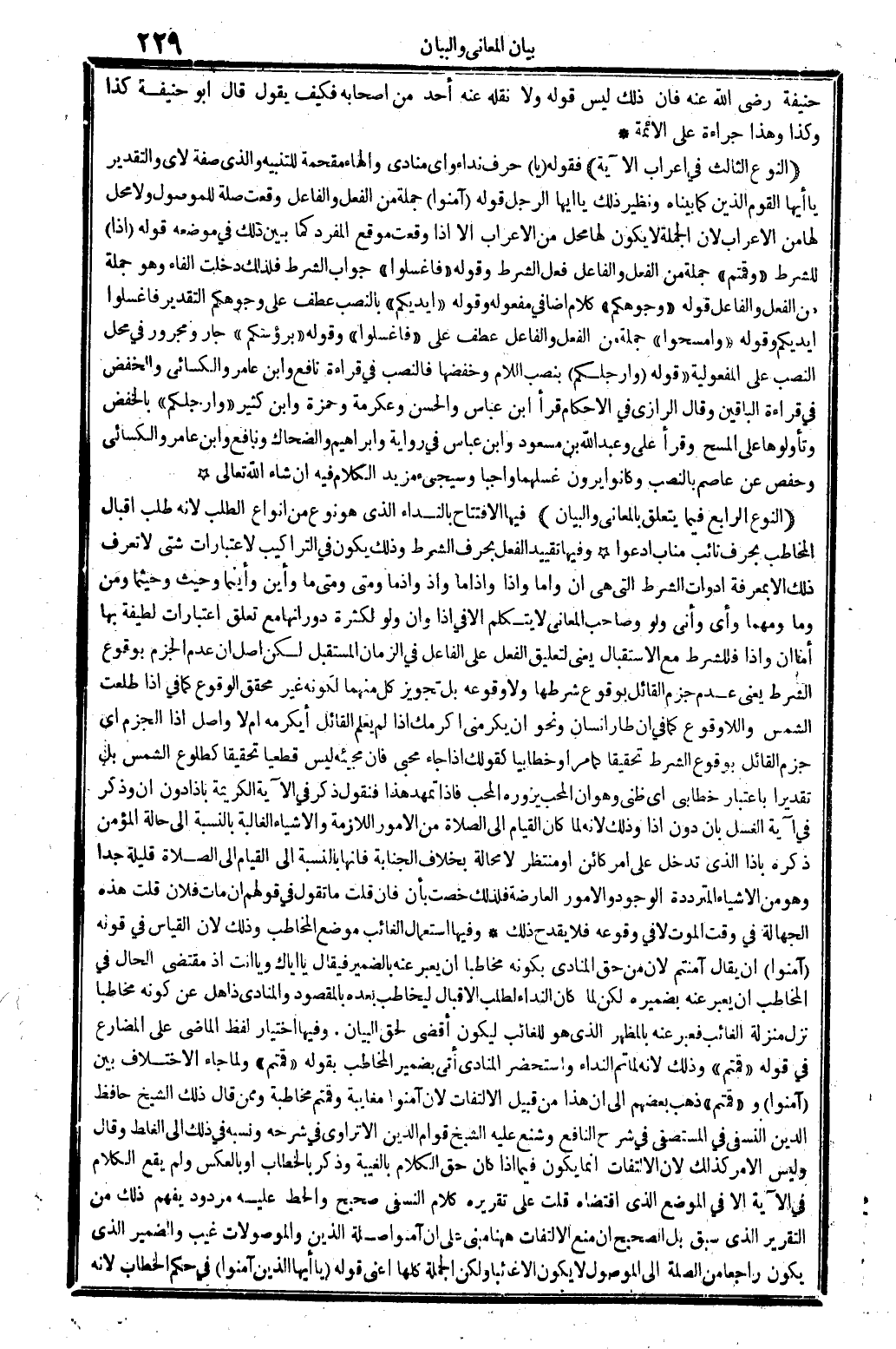حنيفَة رَضِي الله عَنهُ فَإِن ذَلِك لَيْسَ قَوْله وَلَا نَقله عَنهُ أحد من أَصْحَابه فَكيف يَقُول قَالَ أَبُو حنيفَة كَذَا وَكَذَا وَهَذَا جَرَاءَة على الْأَئِمَّة (النَّوْع الثَّالِث فِي إِعْرَاب الْآيَة) فَقَوله {يَا} حرف نِدَاء وَأي منادى وَالْهَاء مقحمة للتّنْبِيه وَالَّذِي صفة لأي وَالتَّقْدِير يَا أَيهَا الْقَوْم الَّذين كَمَا بَيناهُ وَنَظِير ذَلِك يَا أَيهَا الرجل قَوْله {آمنُوا} جملَة من الْفِعْل وَالْفَاعِل وَقعت صلَة للموصول وَلَا مَحل لَهَا من الْإِعْرَاب لِأَن الْجُمْلَة لَا يكون لَهَا مَحل من الْإِعْرَاب إِلَّا إِذا وَقعت موقع الْمُفْرد كَمَا بَين ذَلِك فِي مَوْضِعه قَوْله {إِذا} للشّرط و {قُمْتُم} جملَة من الْفِعْل وَالْفَاعِل فعل الشَّرْط وَقَوله {فَاغْسِلُوا} جَوَاب الشَّرْط فَلذَلِك دخلت الْفَاء وَهُوَ جملَة من الْفِعْل وَالْفَاعِل قَوْله {وُجُوهكُم} كَلَام إضافي مَفْعُوله وَقَوله {أَيْدِيكُم} بِالنّصب عطف على وُجُوهكُم التَّقْدِير فَاغْسِلُوا أَيْدِيكُم وَقَوله {وامسحوا} جملَة من الْفِعْل وَالْفَاعِل عطف على {فَاغْسِلُوا} وَقَوله {برؤسكم} جَار ومجرور فِي مَحل النصب على المفعولية قَوْله {وأرجلكم} بِنصب اللَّام وخفضها فالنصب فِي قِرَاءَة نَافِع وَابْن عَامر وَالْكسَائِيّ والخفض فِي قِرَاءَة البَاقِينَ وَقَالَ الرَّازِيّ فِي الْأَحْكَام قَرَأَ ابْن عَبَّاس وَالْحسن وَعِكْرِمَة وَحَمْزَة وَابْن كثير {وأرجلكم} بالخفض وتأولوها على الْمسْح وَقَرَأَ عَليّ وَعبد الله بن مَسْعُود وَابْن عَبَّاس فِي رِوَايَة وَإِبْرَاهِيم وَالضَّحَّاك وَنَافِع وَابْن عَامر وَالْكسَائِيّ وَحَفْص عَن عَاصِم بِالنّصب وَكَانُوا يرَوْنَ غسلهمَا وَاجِبا وَسَيَجِيءُ مزِيد الْكَلَام فِيهِ إِن شَاءَ الله تَعَالَى (النَّوْع الرَّابِع فِيمَا يتَعَلَّق بالمعاني وَالْبَيَان) فِيهَا الِافْتِتَاح بالنداء الَّذِي هُوَ نوع من أَنْوَاع الطّلب لِأَنَّهُ طلب إقبال الْمُخَاطب بِحرف نَائِب مناب ادعوا وفيهَا تَقْيِيد الْفِعْل بِحرف الشَّرْط وَذَلِكَ يكون فِي التراكيب لاعتبارات شَتَّى لَا تعرف ذَلِك إِلَّا بِمَعْرِِفَة أدوات الشَّرْط الَّتِي هِيَ إِن وَإِمَّا وَإِذا وَإِذا مَا وَإِذ وإذما وَمَتى وَمَتى مَا وَأَيْنَ وأينما وَحَيْثُ وحيثما وَمن وَمَا وَمهما وَأي وأنى وَلَو وَصَاحب الْمعَانِي لَا يتَكَلَّم إِلَّا فِي إِذا وَإِن وَلَو لِكَثْرَة دورانها مَعَ تعلق اعتبارات لَطِيفَة بهَا أما إِن وَإِذا فللشرط مَعَ الِاسْتِقْبَال يَعْنِي لتعليق الْفِعْل على الْفَاعِل فِي الزَّمَان الْمُسْتَقْبل لَكِن أصل إِن عدم الْجَزْم بِوُقُوع الشَّرْط يَعْنِي عدم جزم الْقَائِل بِوُقُوع شَرطهَا وَلَا وُقُوعه بل تَجْوِيز كل مِنْهُمَا لكَونه غير مُحَقّق الْوُقُوع كَمَا فِي إِذا طلعت الشَّمْس واللاوقوع كَمَا فِي إِن طَار إِنْسَان وَنَحْو إِن يكرمني أكرمك إِذا لم يعلم الْقَائِل أيكرمه أم لَا وأصل إِذا الْجَزْم أَي جزم الْقَائِل بِوُقُوع الشَّرْط تَحْقِيقا كَمَا مر أَو خطابيا كَقَوْلِك إِذا جَاءَ محبي فَإِن مَجِيئه لَيْسَ قَطْعِيا تَحْقِيقا كطلوع الشَّمْس بل تَقْديرا بِاعْتِبَار خطابي أَي ظَنِّي وَهُوَ أَن الْمُحب يزوره الْمُحب فَإِذا تمهد هَذَا فَنَقُول ذكر فِي الْآيَة الْكَرِيمَة بإذا دون إِن وَذكر فِي آيَة الْغسْل بإن دون إِذا وَذَلِكَ لِأَنَّهُ لما كَانَ الْقيام إِلَى الصَّلَاة من الْأُمُور اللَّازِمَة والأشياء الْغَالِبَة بِالنِّسْبَةِ إِلَى حَالَة الْمُؤمن ذكره بإذا الَّذِي تدخل على أَمر كَائِن أَو منتظر لَا محَالة بِخِلَاف الْجَنَابَة فَإِنَّهَا بِالنِّسْبَةِ إِلَى الْقيام إِلَى الصَّلَاة قَليلَة جدا وَهُوَ من الْأَشْيَاء المترددة الْوُجُود والأمور الْعَارِضَة فَلذَلِك خصت بِأَن فَإِن قلت مَا تَقول فِي قَوْلهم إِن مَاتَ فلَان قلت هَذِ